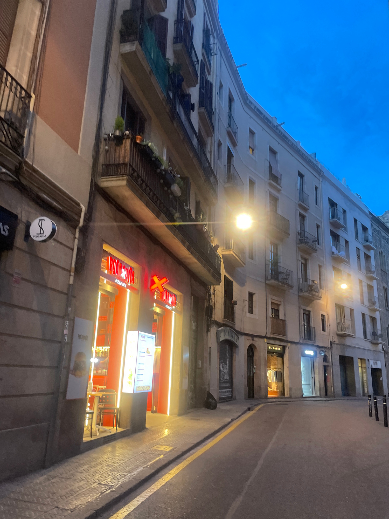 The image shows a street view in Barcelona, Spain, at dusk. The scene is oriented vertically, with tall buildings lining the left side of the street. These buildings have multiple floors, with balconiβ¦read more