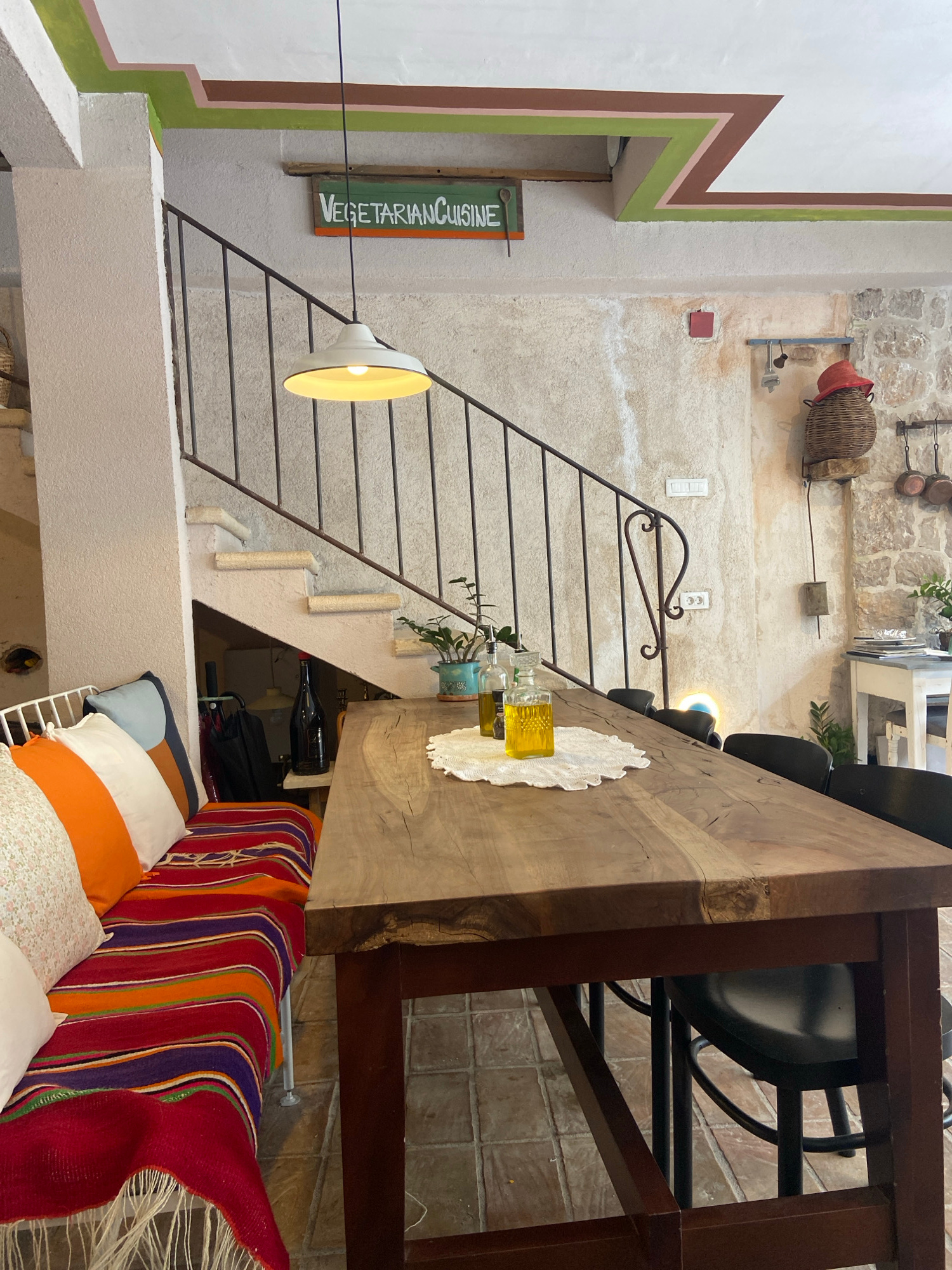 The image shows an indoor space in Stari Bar, Montenegro. A wooden dining table is the central element, with a dark metal chair partially visible on the right side. A white doily and bottles, possibly…read more