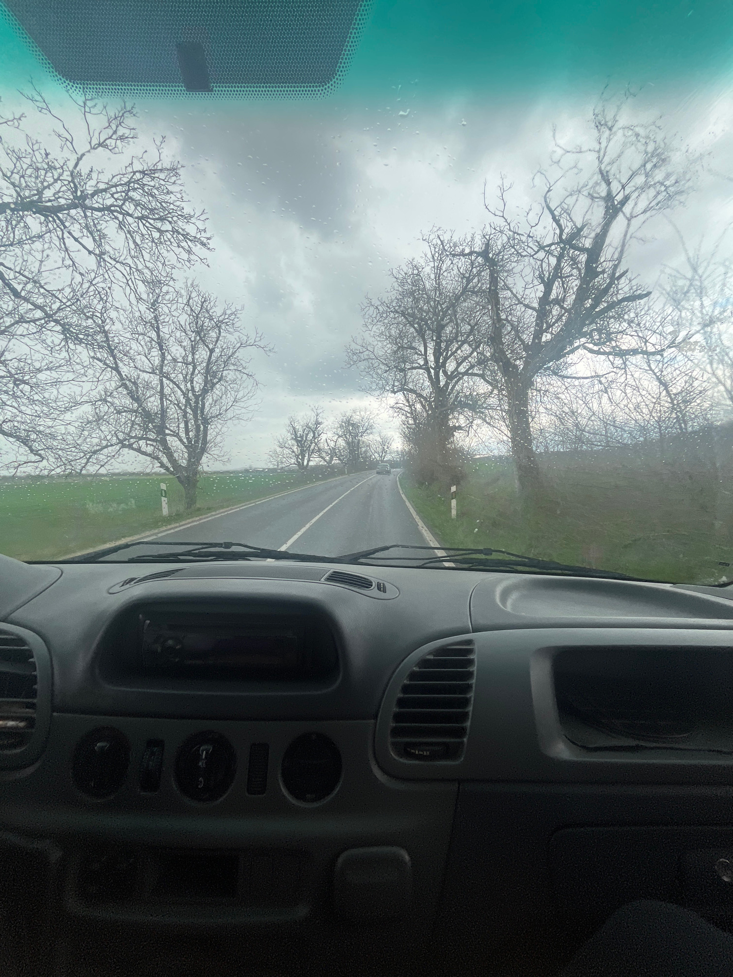 The image shows a view from inside a vehicle, likely a van, traveling along a road. The dashboard is visible in the foreground. Outside, the road stretches into the distance, flanked by bare trees on…read more
