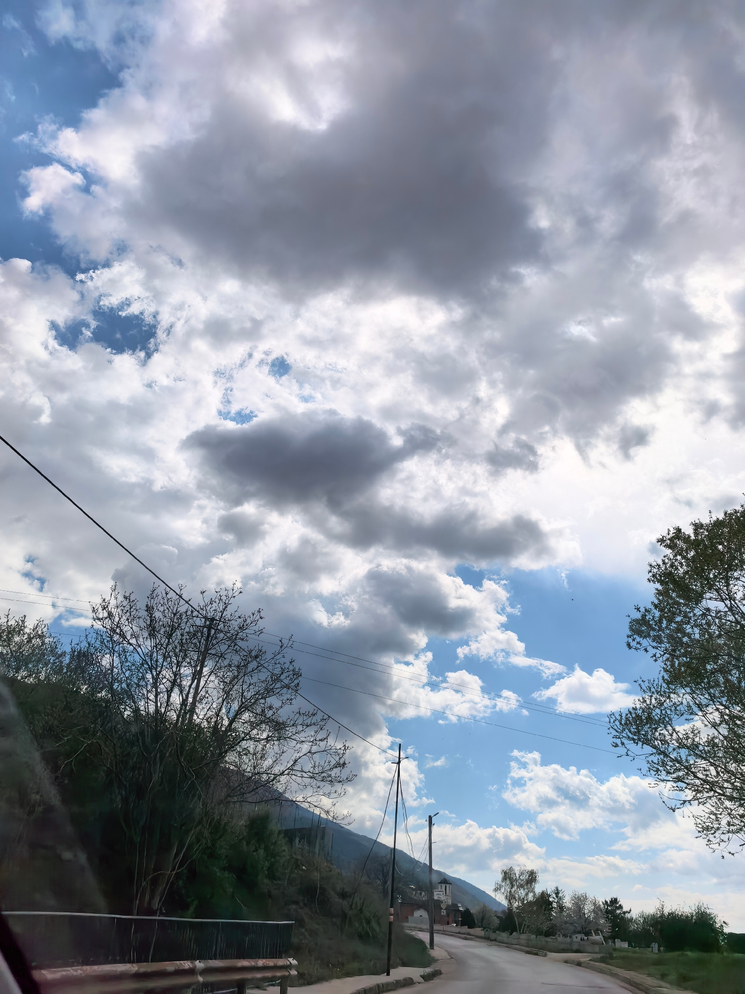 The image shows a street view with a cloudy sky. Power lines stretch across the top portion of the image. Trees are present on either side of the road, with one tree predominantly on the left side and…read more