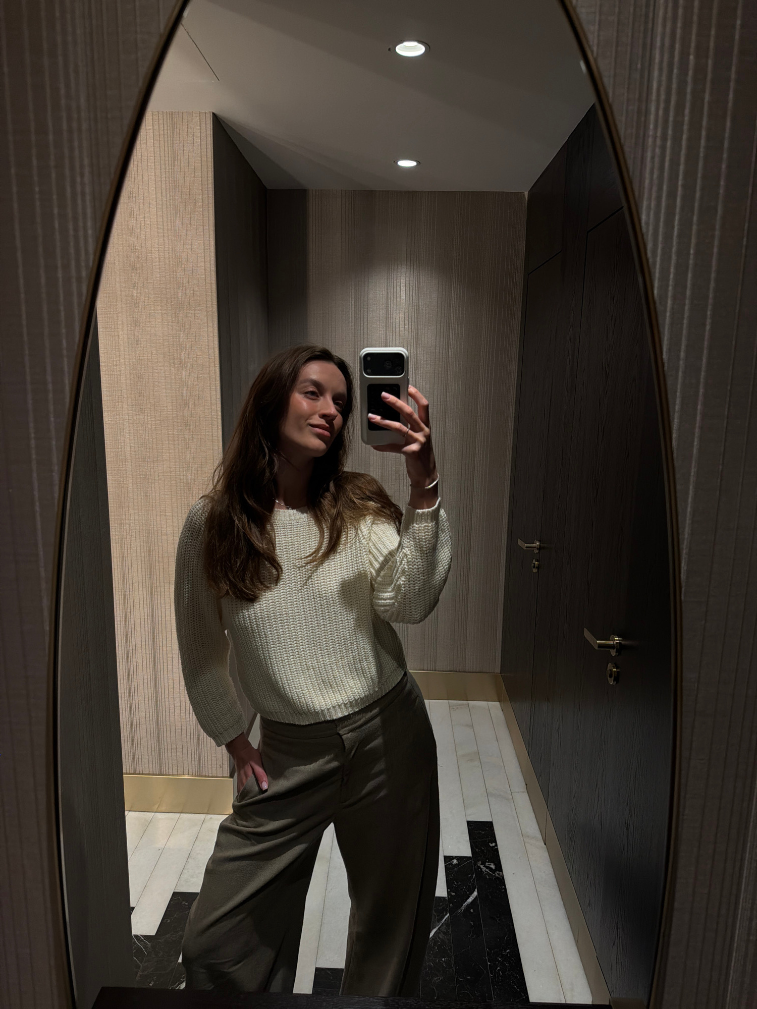 A woman is taking a selfie in a mirror in an interior space. The space features a light-colored paneled wall with two embedded lights, dark-stained wooden paneling on the ceiling, and a black-and-whit…read more