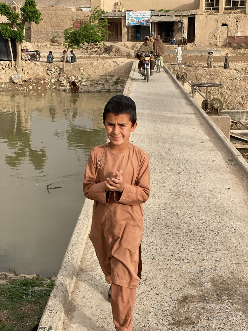 In Khana Gerdab, Afghanistan, a young boy in a brown tunic and cap stands on a concrete bridge, looking directly at the viewer. The boy's hands are clasped together in front of him. To the left of theβ¦read more