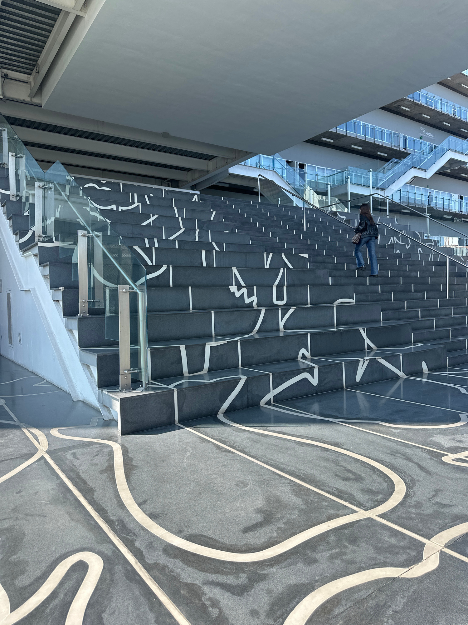 The image depicts a person walking on stairs with white graphic designs at the Soumaya Museum in Mexico City, Mexico. The museum's architectural elements, including glass railings and a distinctive ex…read more