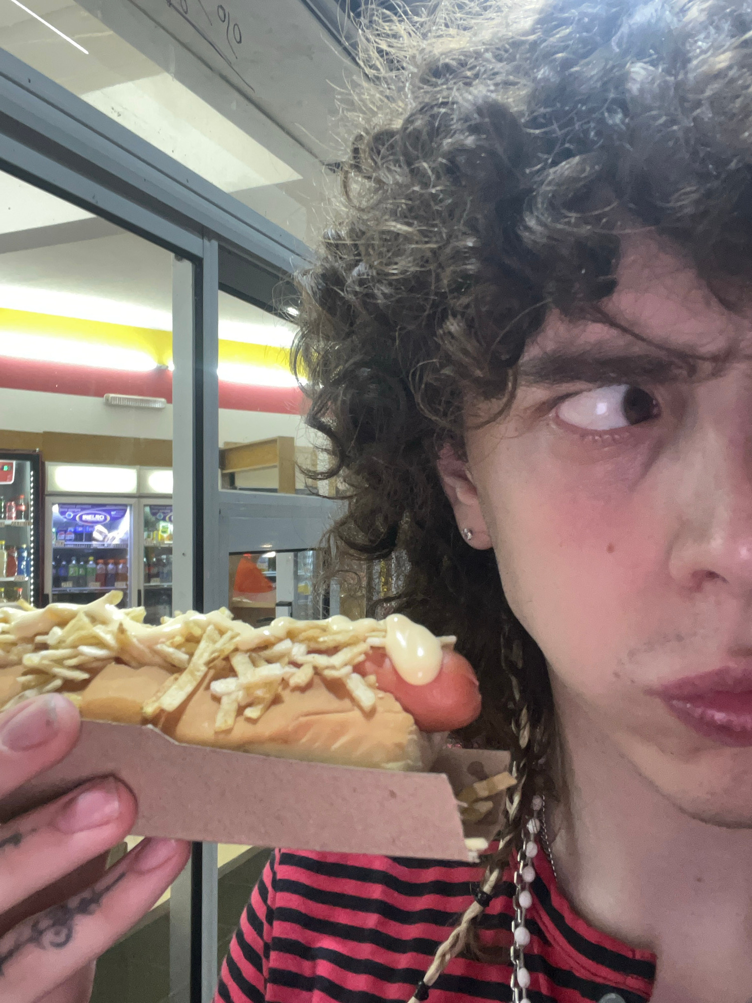A person with curly hair is holding a hot dog with toppings. The person is wearing a red and black striped shirt and a beaded necklace. The hot dog is in a cardboard holder and topped with mayonnaise…read more