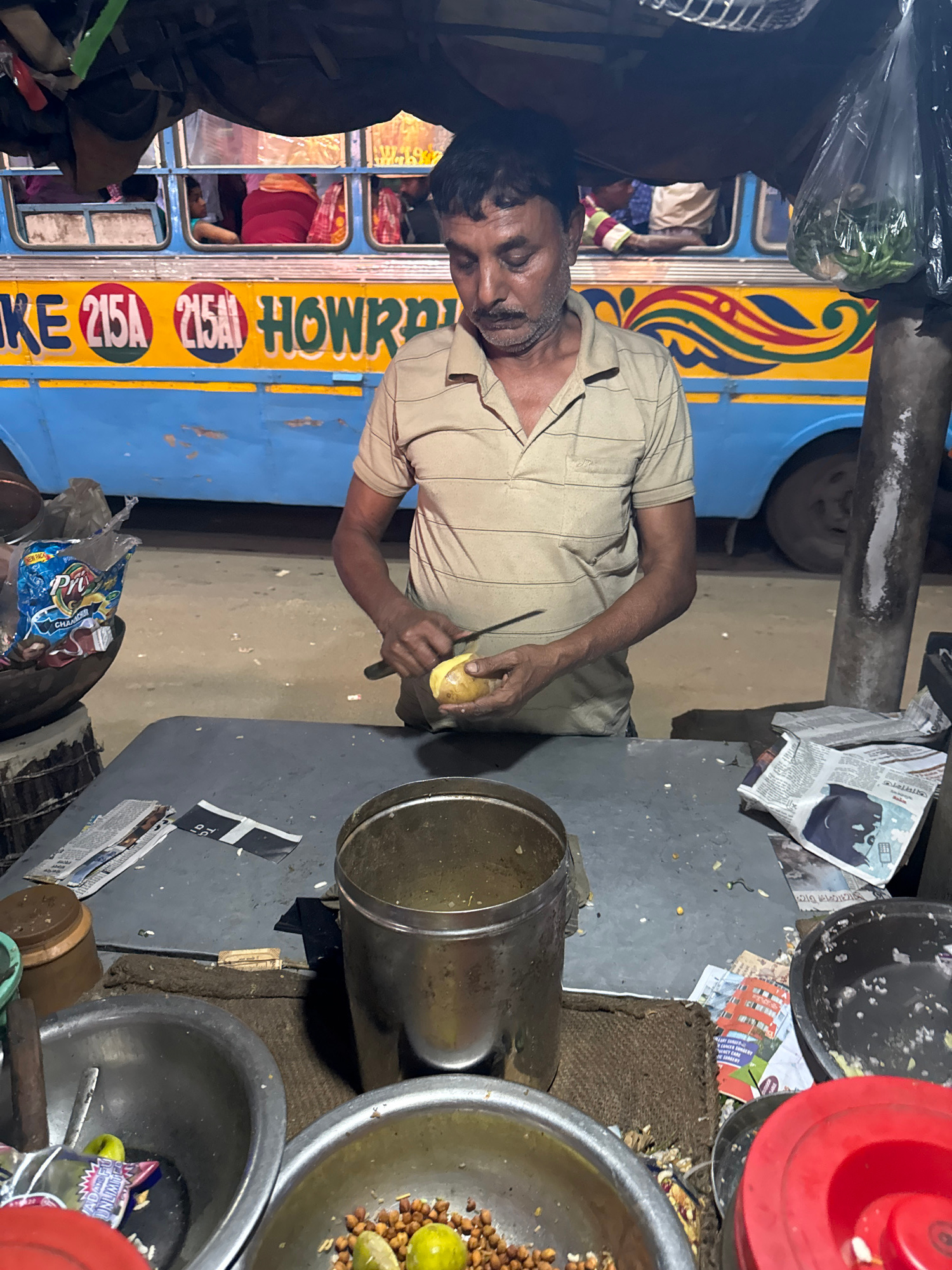 A man stands in front of a bus in Kolkata, India. He is peeling a potato or a similar root vegetable with a knife, likely preparing food for sale. He is positioned behind a table laden with stainless…read more