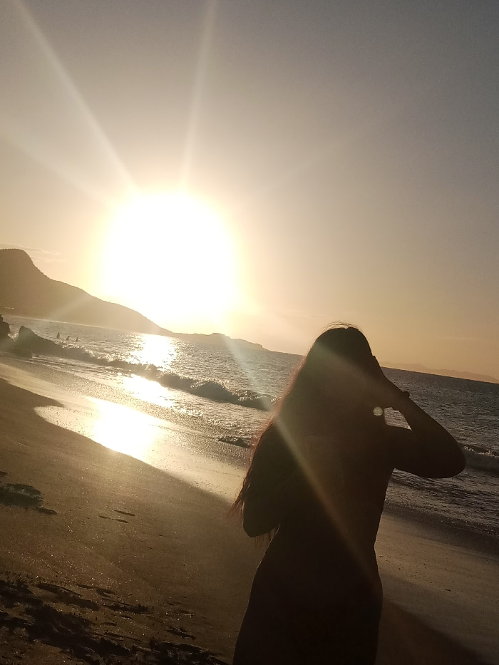 A beach scene features a silhouetted figure of a woman with long hair standing on the sand, positioned with her back to the camera. The sun is setting in the background, creating a bright, golden glow…read more