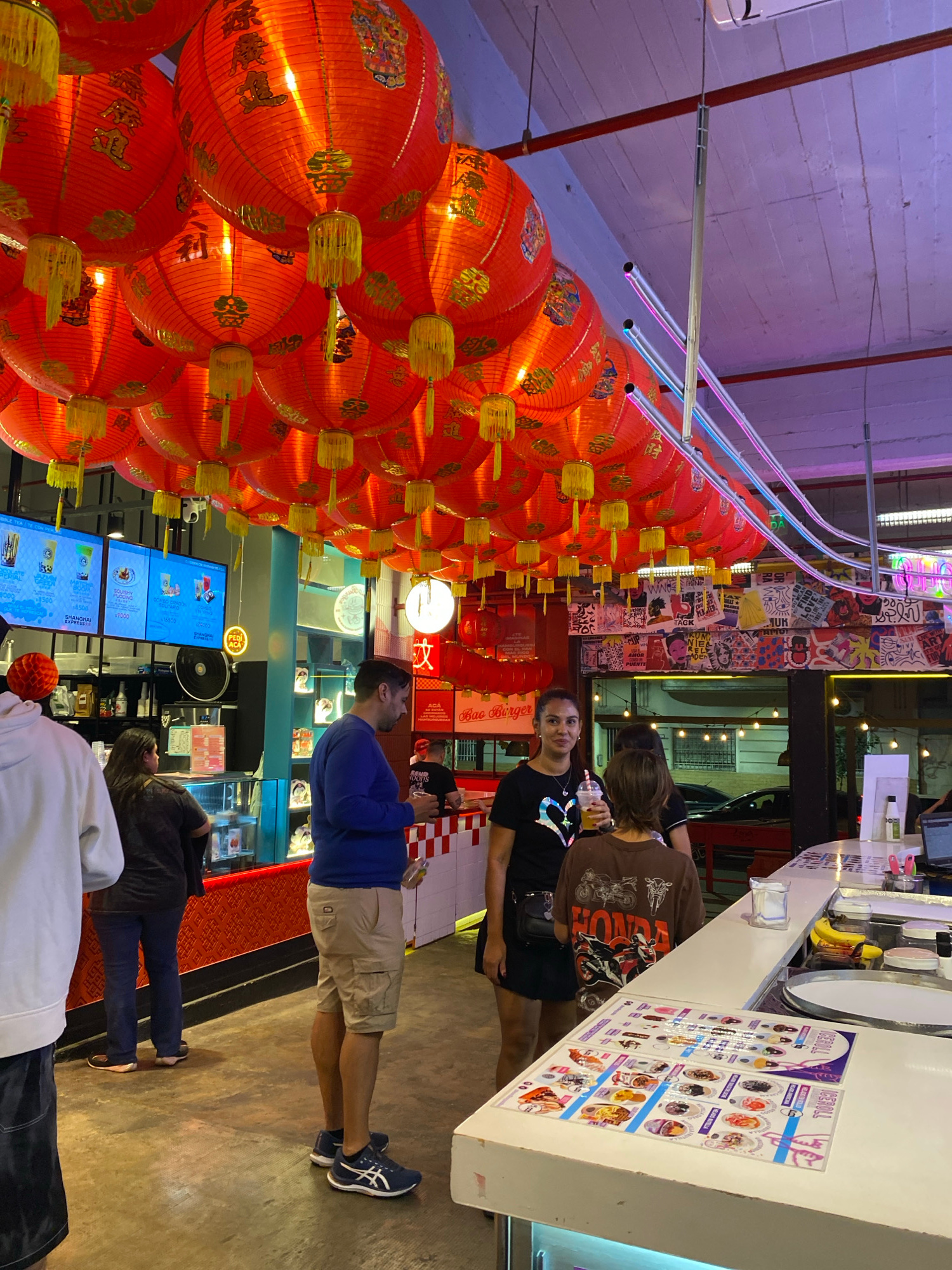 Here's a forensic description of the image: **Scene:** Indoor food establishment. The view is angled upwards, showcasing a ceiling crowded with strings of Chinese red lanterns. Fluorescent lighting fâŚread more