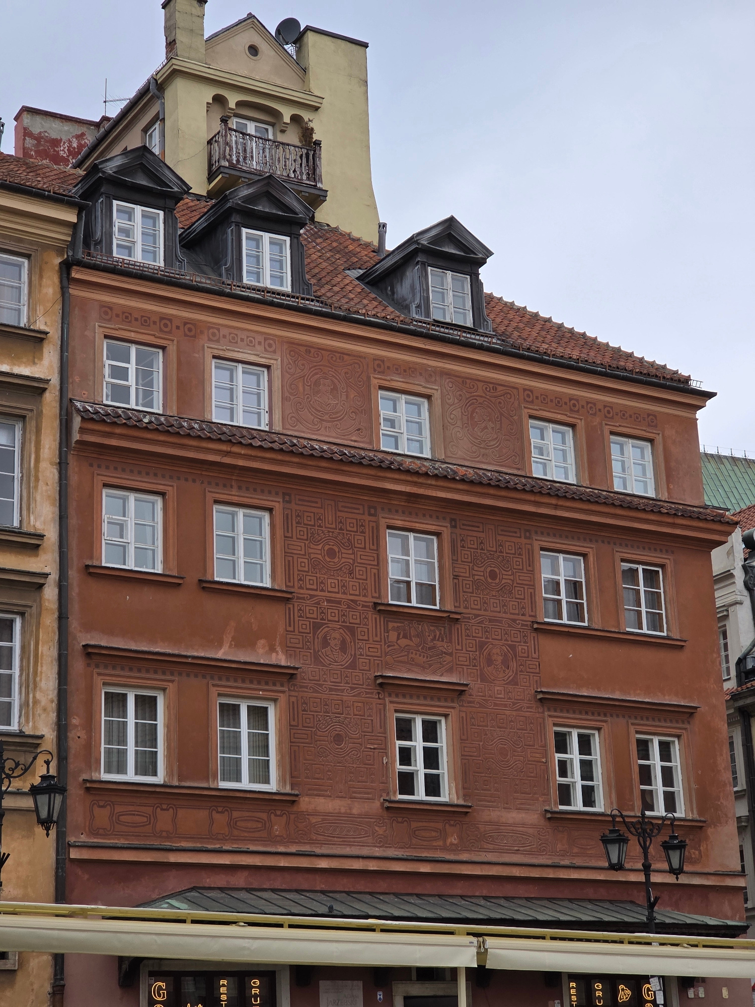The image shows a view of buildings in the city of Warsaw, Poland. The buildings are historic and ornate, with multiple windows and detailed facades. The architecture is reminiscent of the Old Town ar…read more