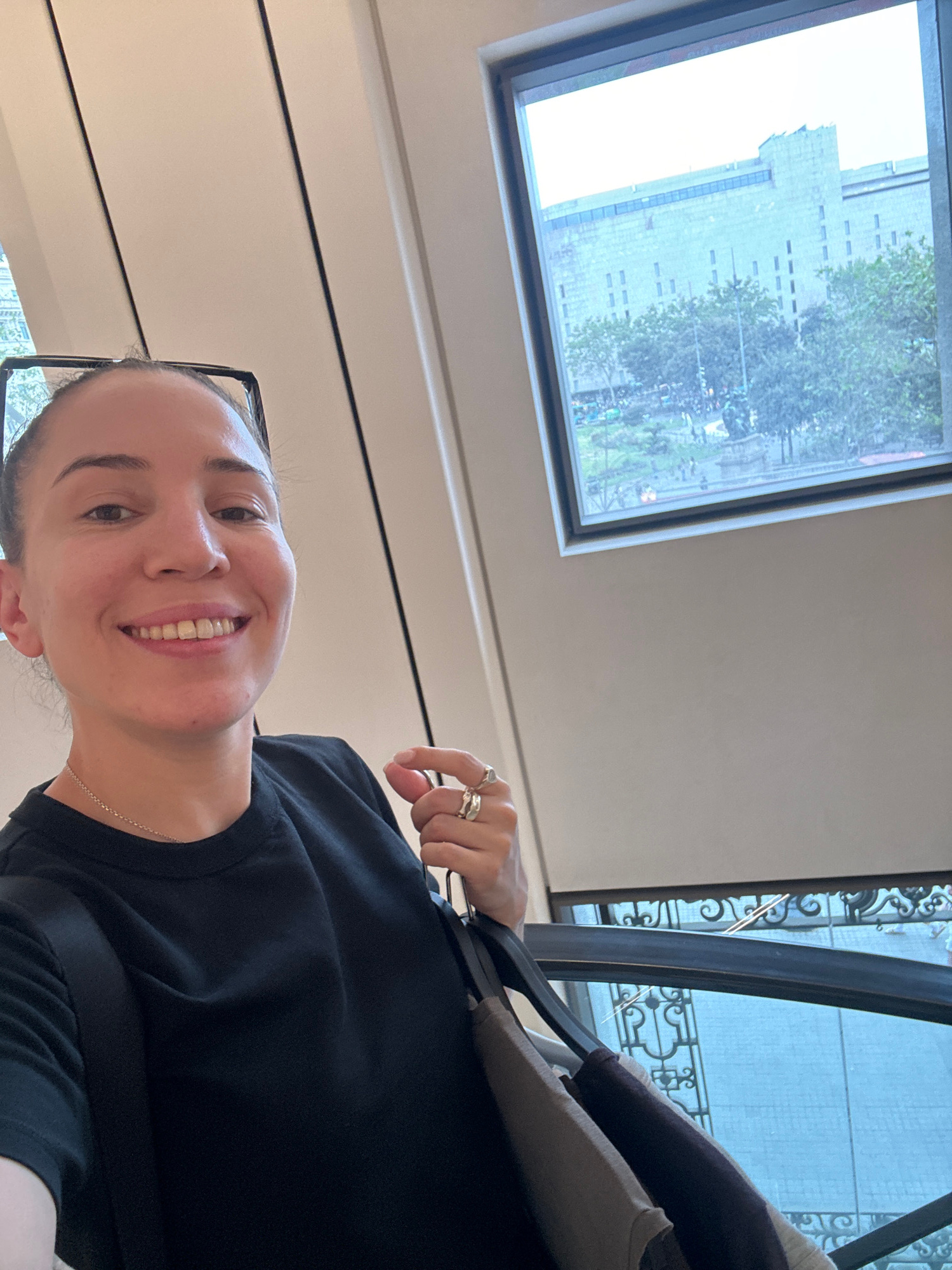 A selfie of a smiling woman with fair skin, brown hair, and a silver necklace. She wears a black shirt and glasses. Her right hand is visible, adorned with rings. In the background, two windows are se…read more