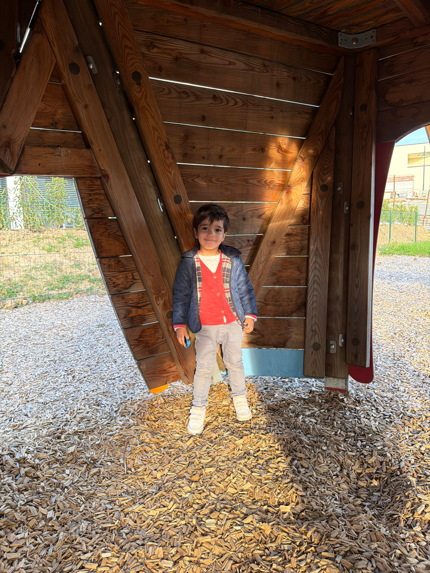 A young child is lying on a wooden structure within a playground, possibly in Junglinster, Luxembourg. The structure is made of brown planks and appears to be a part of a climbing frame or playhouse.…read more