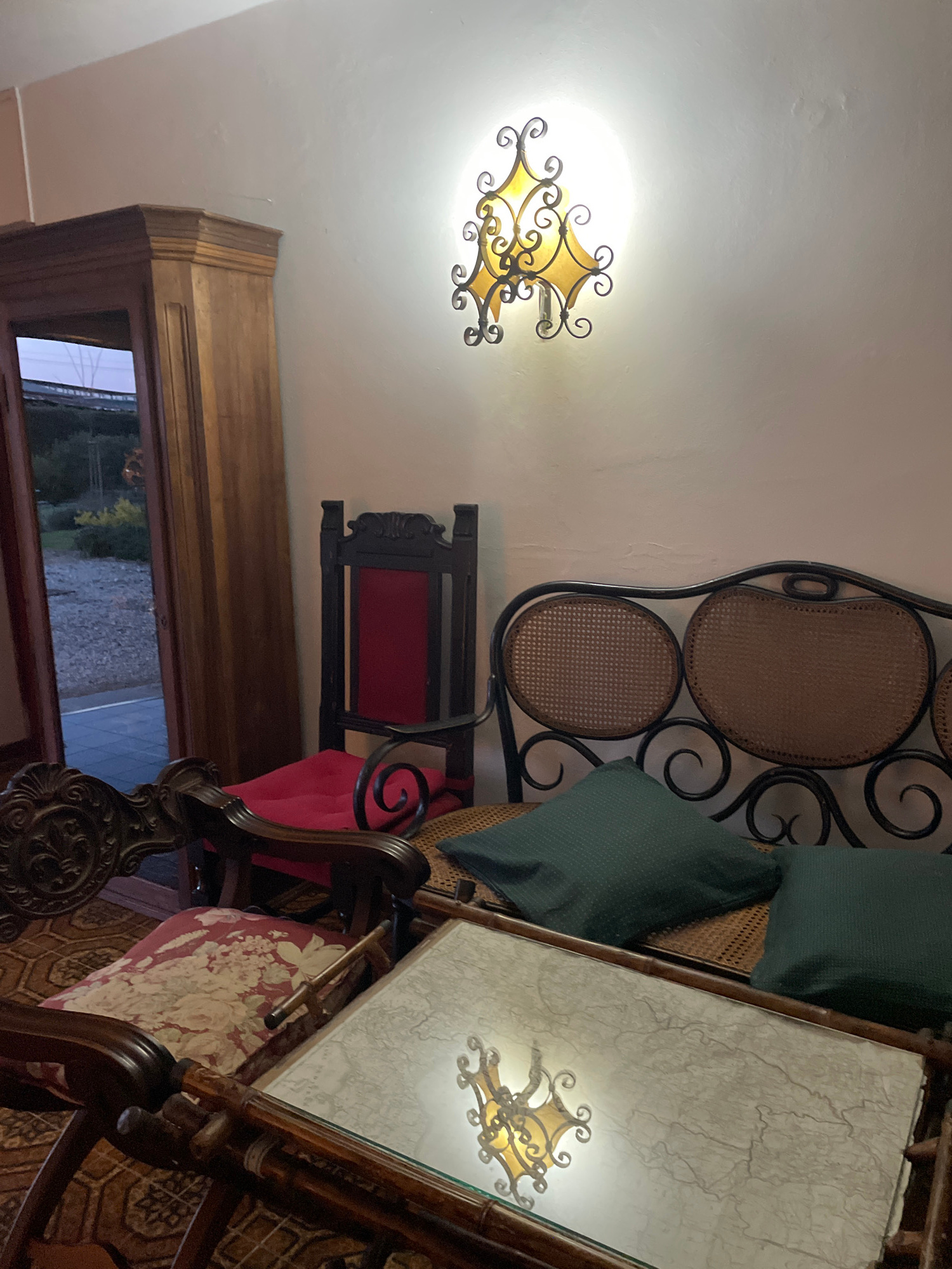The photograph depicts an interior scene with antique furniture and lighting. A wall-mounted ornate light fixture casts a glow on the adjacent white wall. Visible furniture includes a caned settee wit…read more