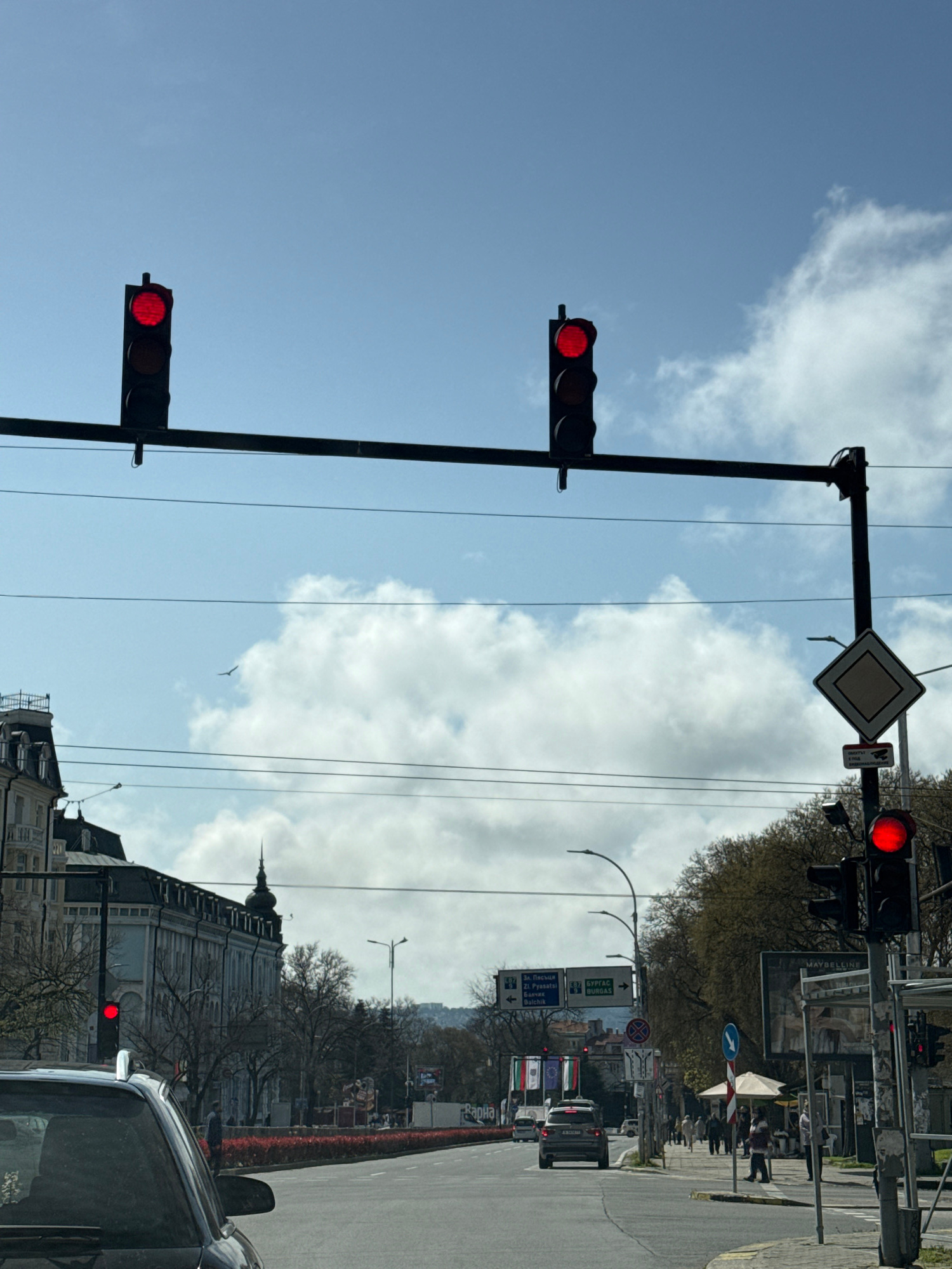The image captures a street scene in Varna, Bulgaria. A series of traffic lights are visible, all displaying red signals. The street has pedestrian activity. Various signage in Cyrillic script is pres…read more