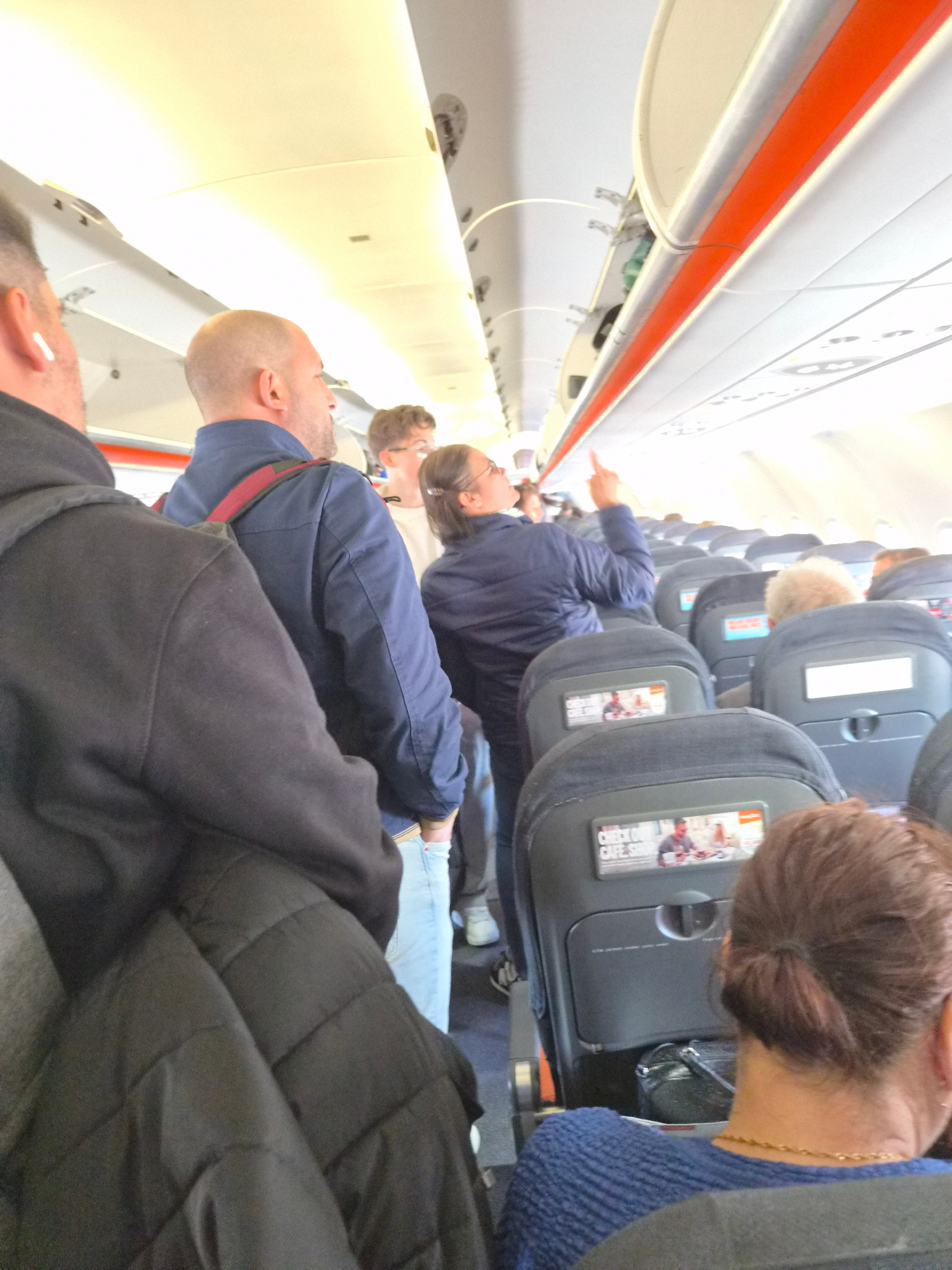 The image captures the interior of an airplane cabin, likely during flight. Several passengers are visible seated in rows. The environment includes airplane seats with headrests and entertainment scre…read more