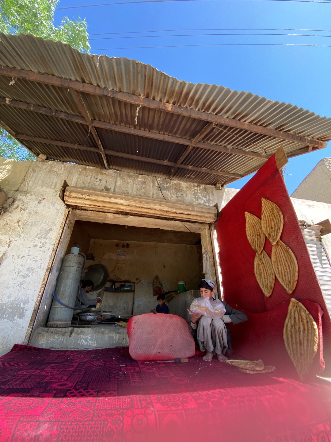 A street-level view in Kandahar, Afghanistan, features an open-fronted bakery or shop. The structure is simple with a corrugated metal roof. Inside, a man is working at a tandoor-style oven, while a c…read more