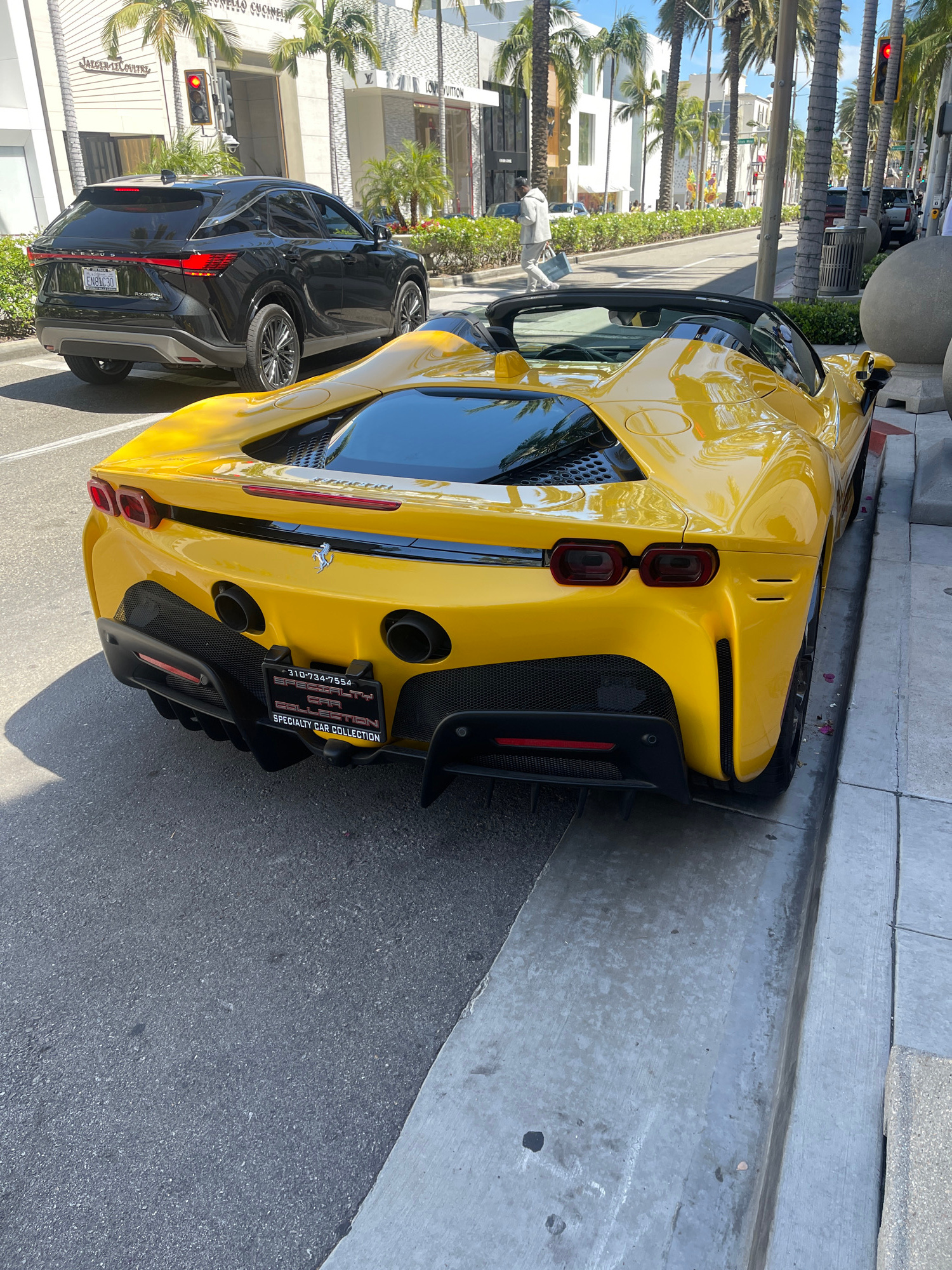 The image shows a yellow Ferrari parked on the street in Beverly Hills, California, USA. The car is parked next to a black SUV. In the background, palm trees and luxury stores can be seen. The area isβ¦read more
