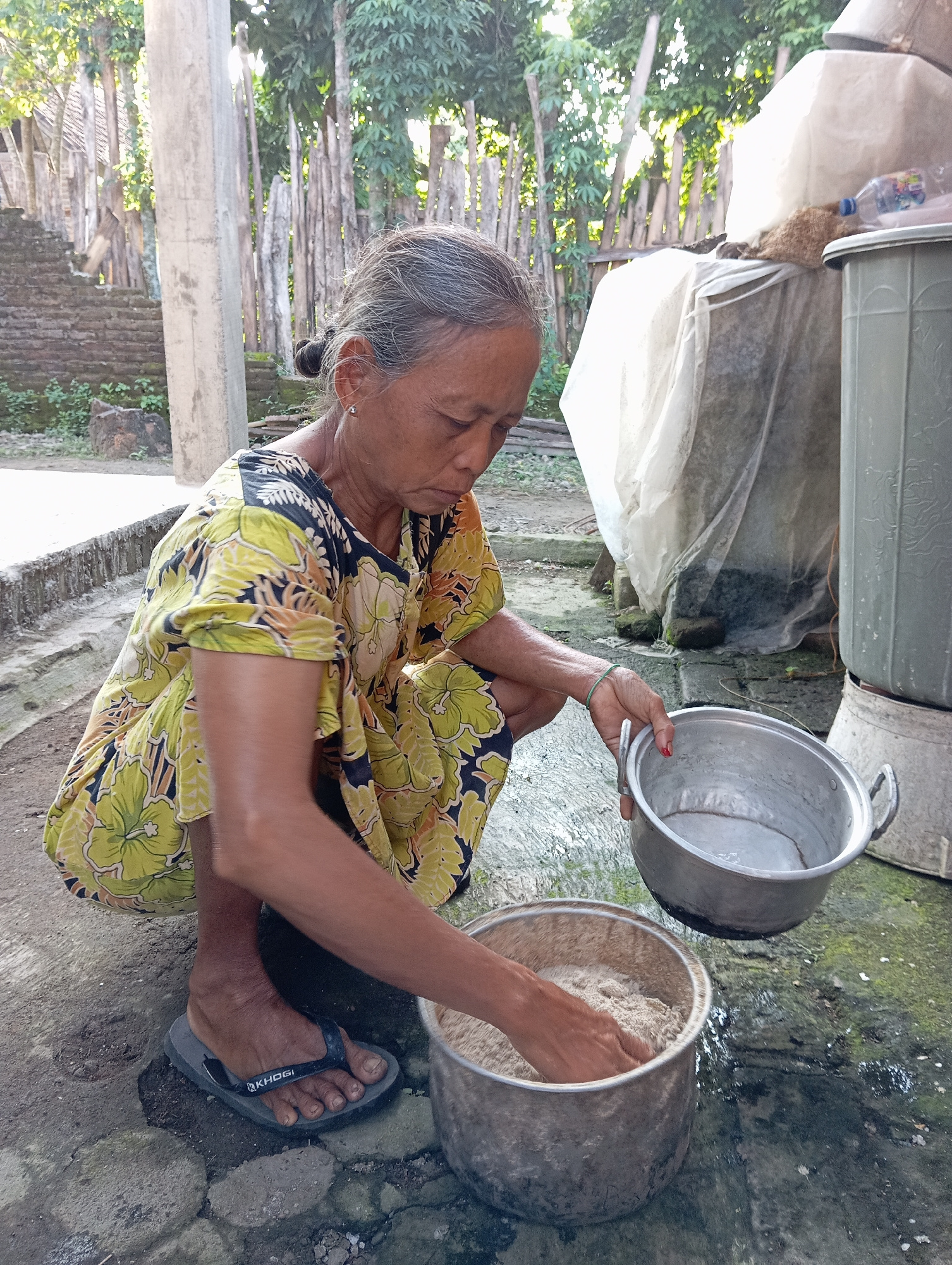 An older woman with graying hair, tied back, is depicted squatting outdoors, focused on a task. She is wearing a yellow, green, and black floral patterned blouse and a dark thong sandal on her right f…read more