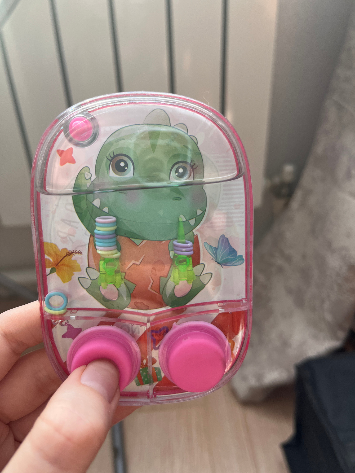 A close-up shot depicts a clear, pink-rimmed water game in the palm of a hand. Inside the game, a cartoon green dinosaur design is visible, along with pink buttons and pastel-colored rings. The backgr…read more