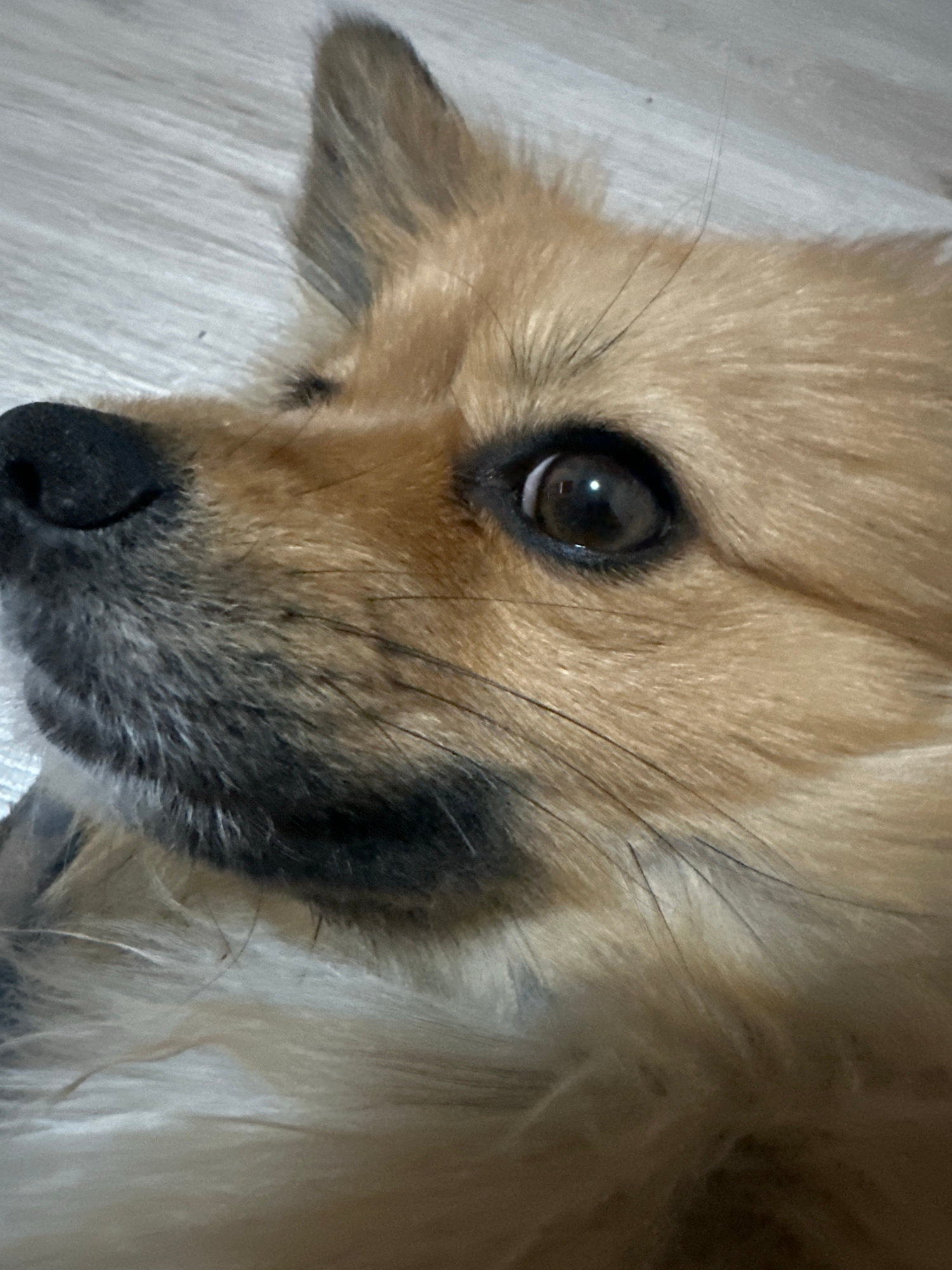 Close-up of a tan-colored dog's face with a black nose. The dog is lying on a white, furry surface. The dog's eye is dark brown. The location is not identifiable as Plovdiv, Bulgaria.