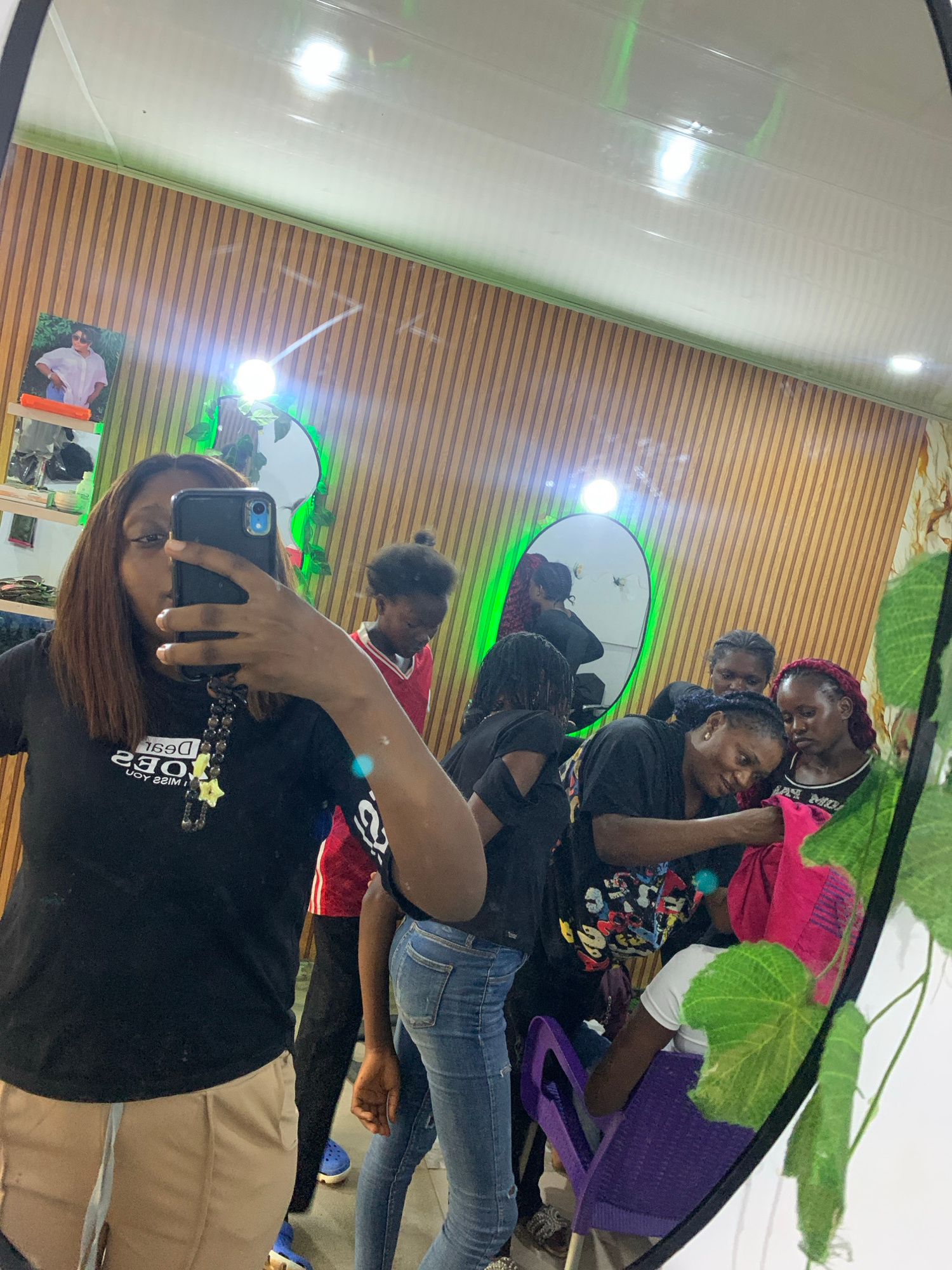 A mirror selfie in a room with a horizontally-paneled wall. A woman holds a phone, facing the mirror, wearing a black t-shirt and khaki pants. Reflected in the mirror are other people. The mirror and…read more