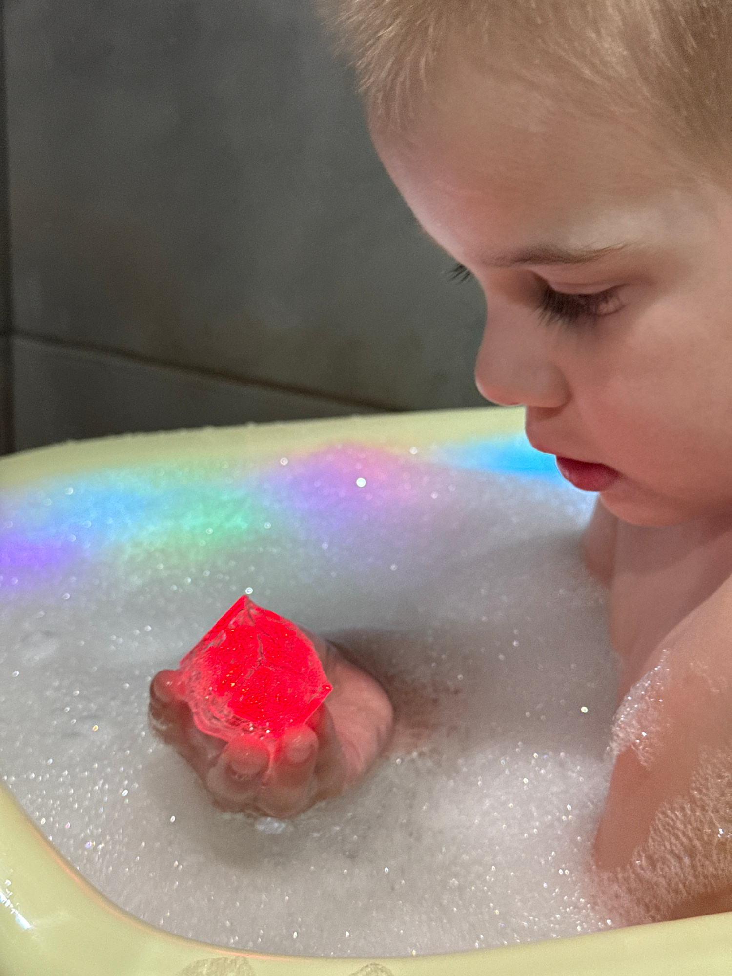A child with blonde hair is in a bathtub filled with soapy bubbles. The child is holding a red, geometrically shaped object in their hand. A rainbow reflection is visible on the side of the bathtub. T…read more