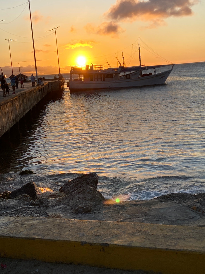 The image depicts a sunset scene over a body of water in Juan Griego, Venezuela. A bright orange sun, low on the horizon, casts a strong golden glow across the sky and reflects on the water's surface. Dark clouds are present above the sun. In the midground, a concrete pier extends from the left toward the center-right, populated by approximately 5-8 silhouetted individuals. Several utility poles with overhead wires are spaced along the pier. A light-colored vessel, possibly a fishing or transport boat, with an enclosed cabin and mast, is situated in the water near the far end of the pier. In the foreground, the immediate edge consists of concrete with a yellow painted line, below which dark, irregular rocks are partially submerged by gentle waves. A prominent green lens flare is visible in the water among these rocks. The water exhibits ripples and reflections of the orange sky. | Open Wire