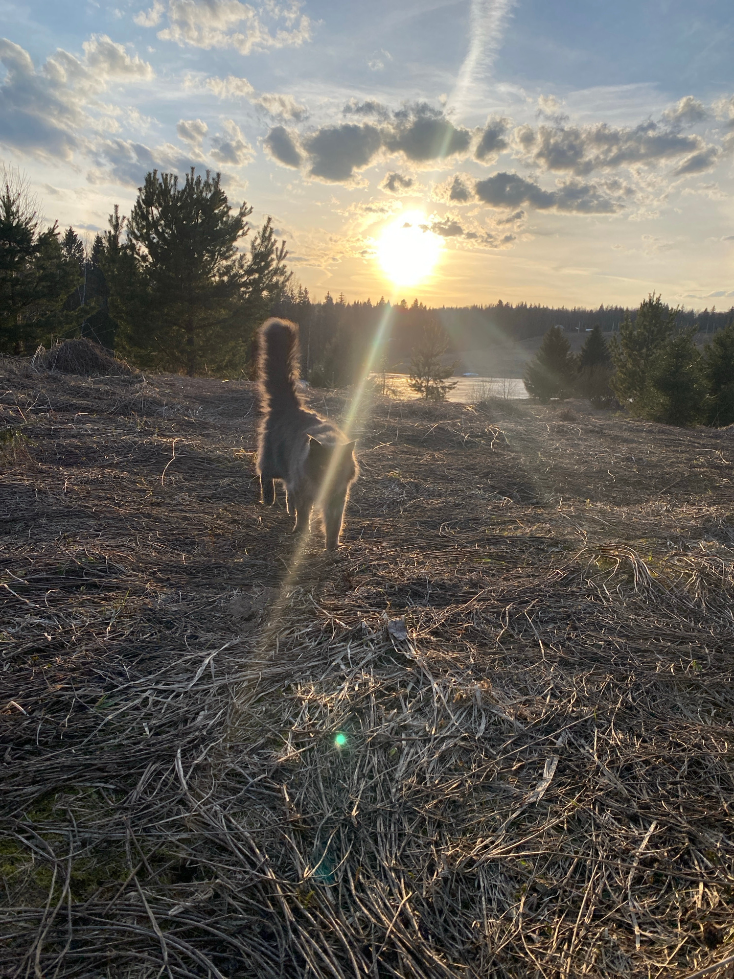 The image depicts a landscape scene at sunset, possibly in the vicinity of Ореховая Гора, Russia, though specific landmarks are not discernible. The sun is low on the horizon, partially obscured by cl…read more