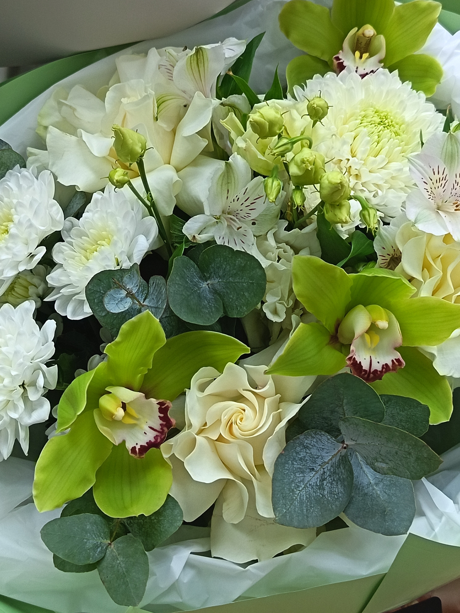 The image shows a close-up of a floral arrangement. Predominantly white chrysanthemums and alstroemeria are arranged alongside green orchids. Eucalyptus foliage is interspersed throughout the bouquet.…read more