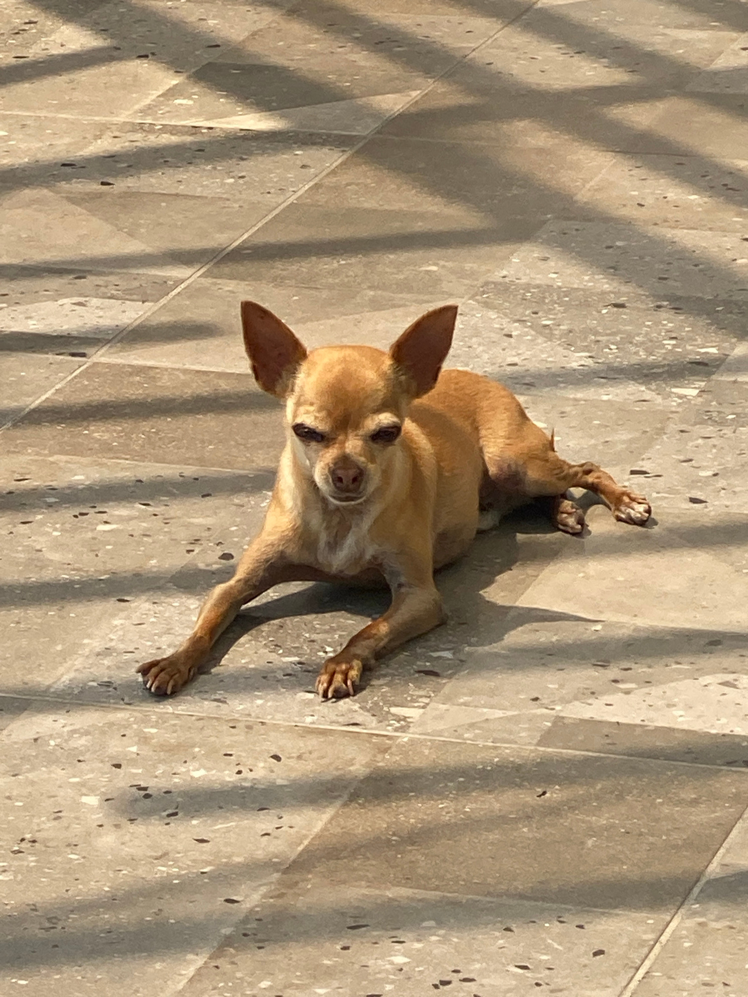 A tan chihuahua lies on a patterned, light gray surface. The dog is positioned diagonally in the frame, its head and front legs angled towards the lower-right corner. Its back legs are stretched upwar…read more