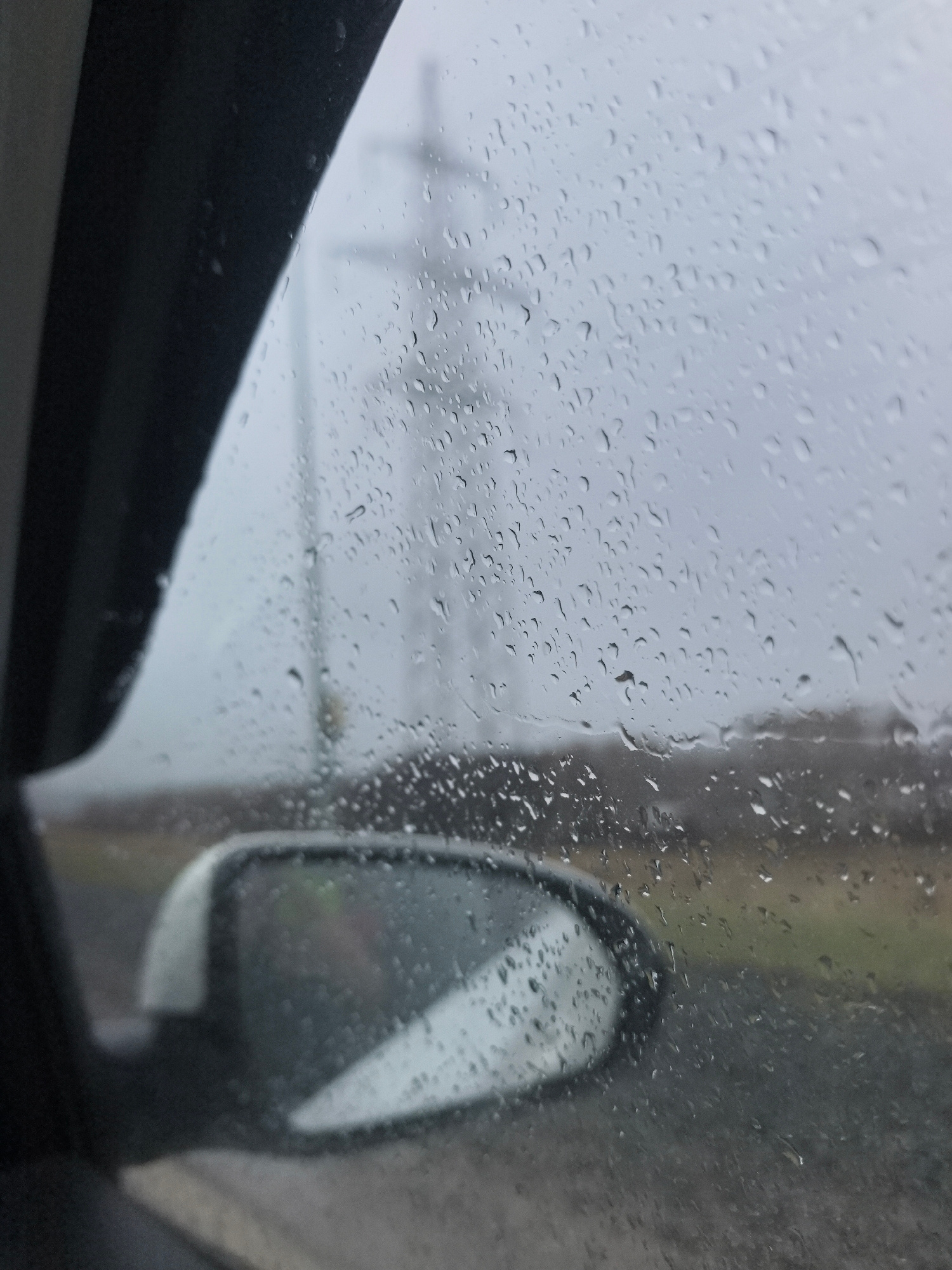 The image presents a somber view from inside a vehicle, looking out a rain-streaked side window on an overcast day. The left side of the frame is occupied by the dark, curved interior panel of the car…read more