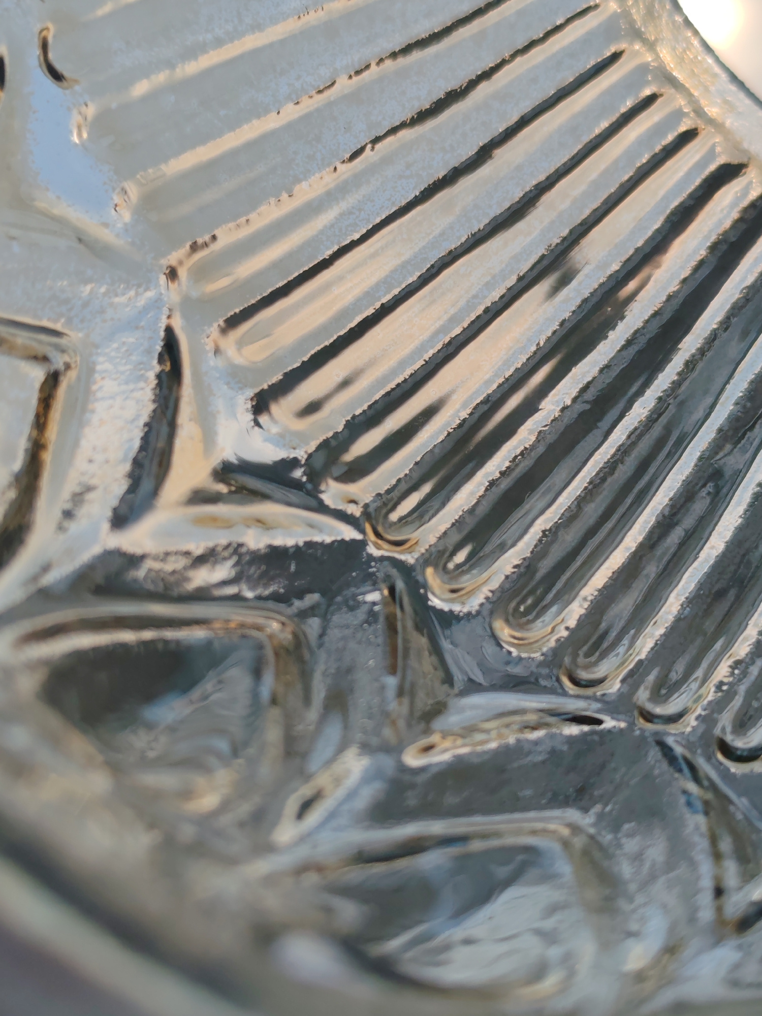 The image is a close-up shot of the textured surface of a glass object, likely a container or dish. The surface is characterized by alternating raised ridges and recessed channels, arranged in a linea…read more