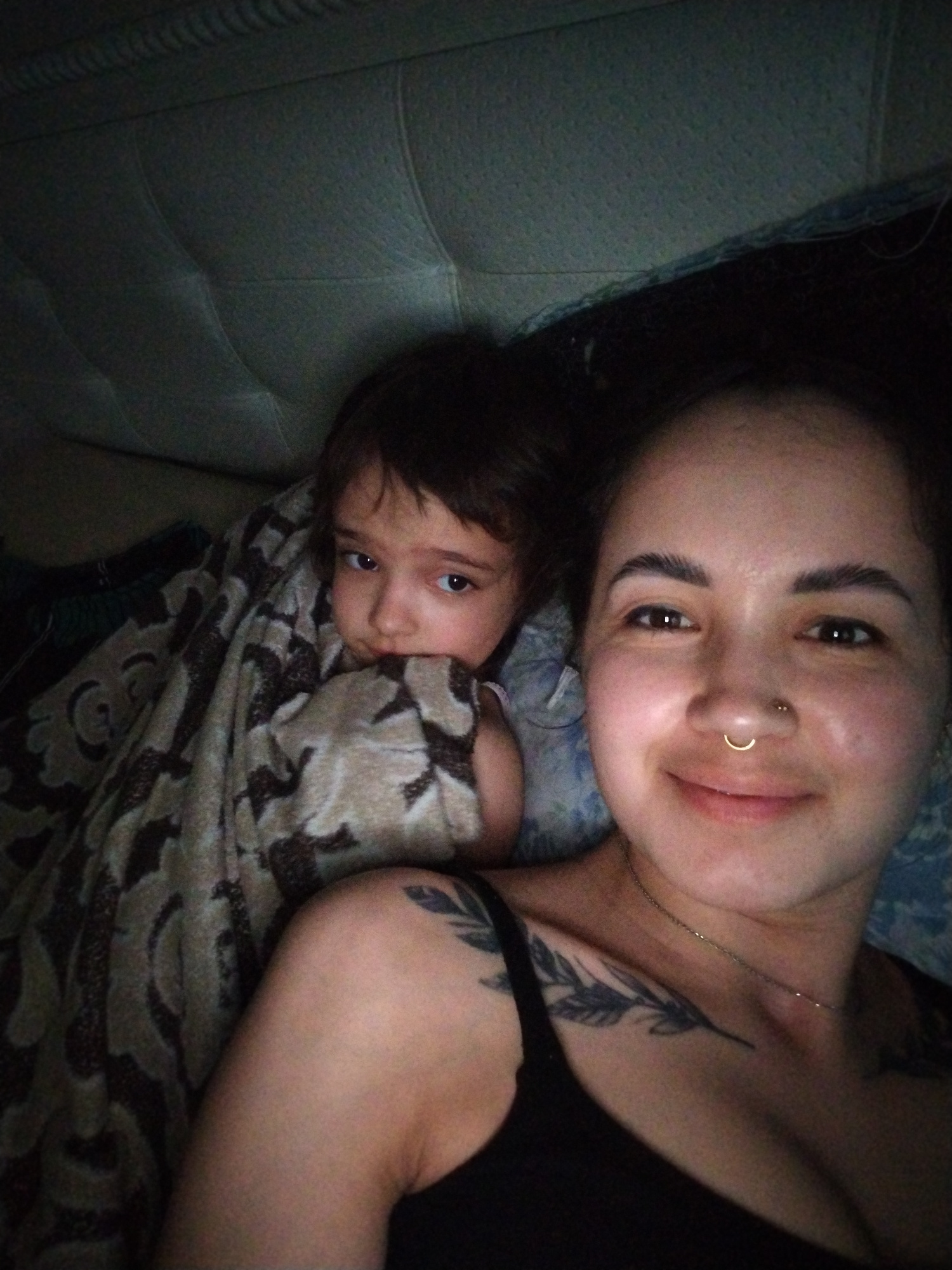 A selfie shows a woman and child in an indoor setting. The woman is on the right side of the frame, facing forward and smiling. She has dark hair pulled back, dark eyebrows, and a nose ring. She wearsβ¦read more