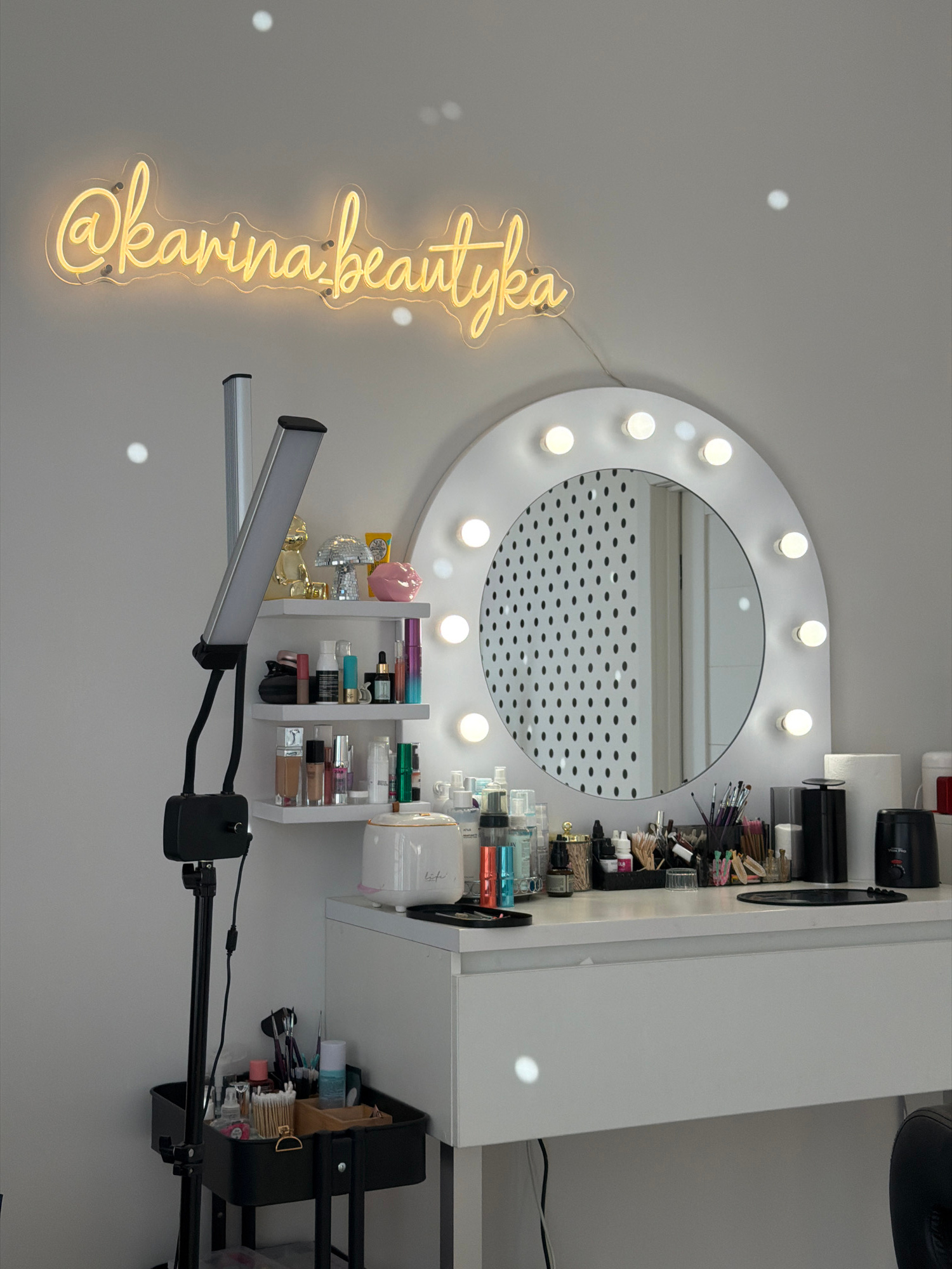 The image shows a vanity area, likely in Riga, Latvia, based on the text visible in the image. A white vanity table is set against a gray wall, illuminated by a bright white vanity mirror surrounded b…read more