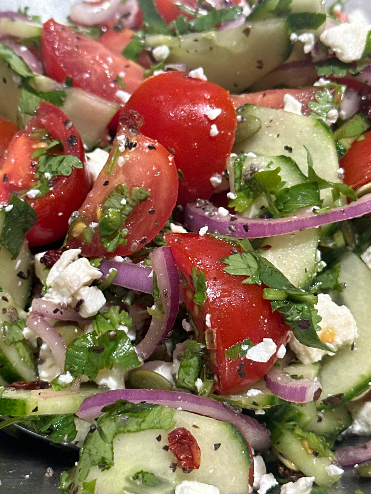 The image displays a close-up, overhead view of a mixed salad. Prominently featured are numerous halved and quartered bright red cherry tomatoes and crescent-shaped slices of green cucumber, many with…read more