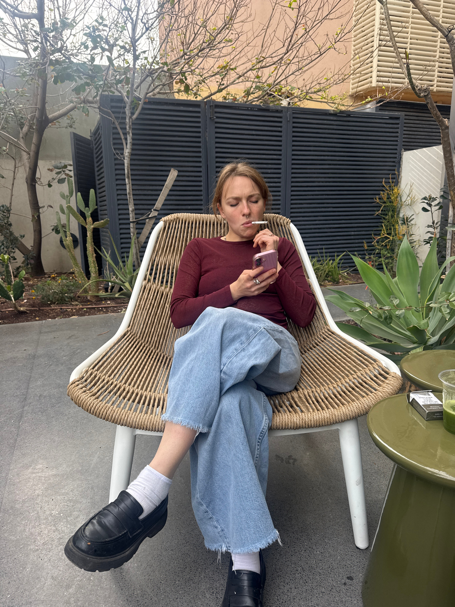 The image displays a female subject seated outdoors in a light-colored woven chair with a white frame. She is wearing a maroon long-sleeved top, light blue wide-leg denim jeans with frayed hems, white…read more