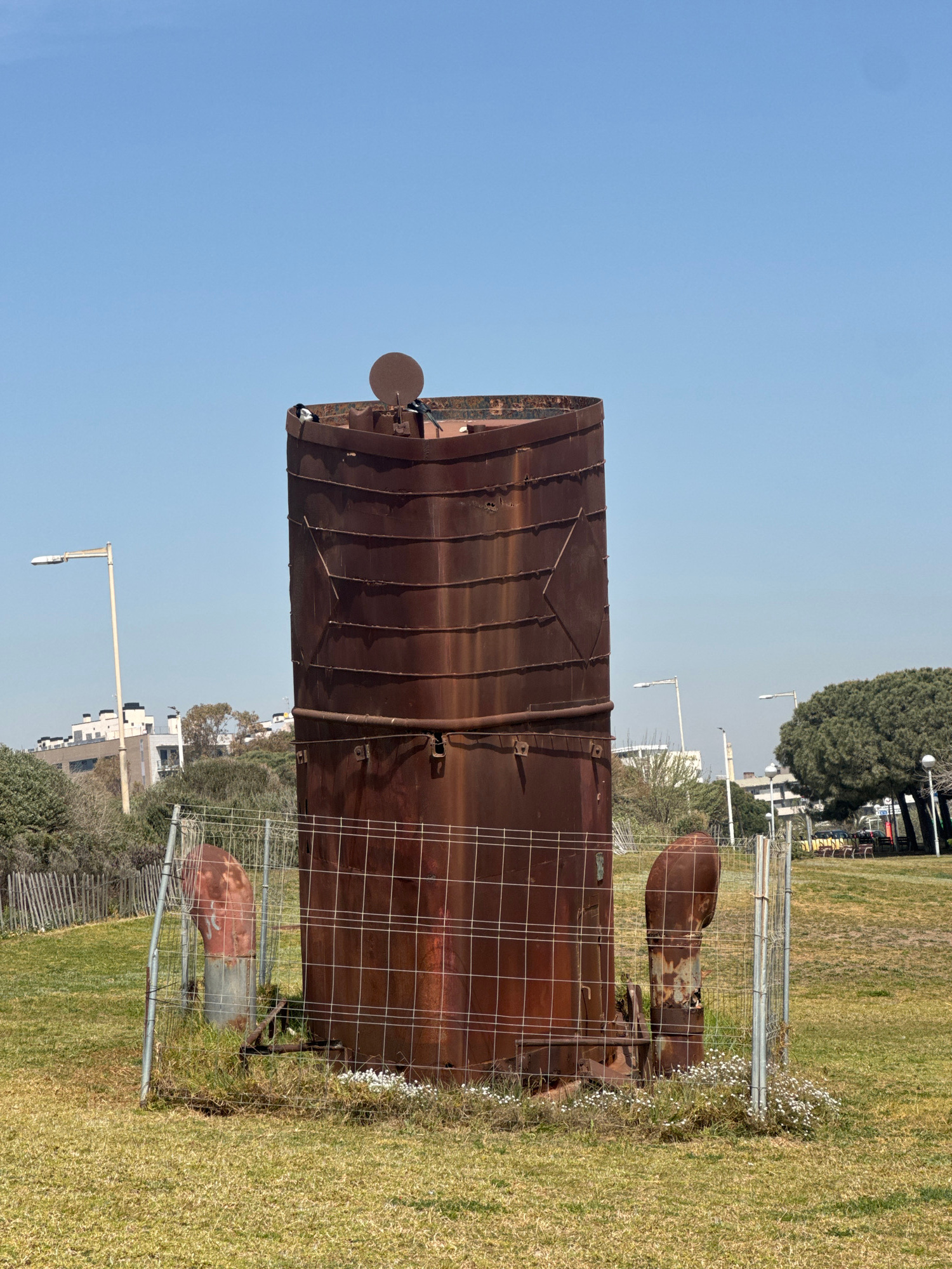 A rusted metal sculpture is in a grassy area in an unspecified location. The sculpture is a vertical cylinder made of metal plates, with a smaller piece attached to the top. The sculpture is enclosed…read more
