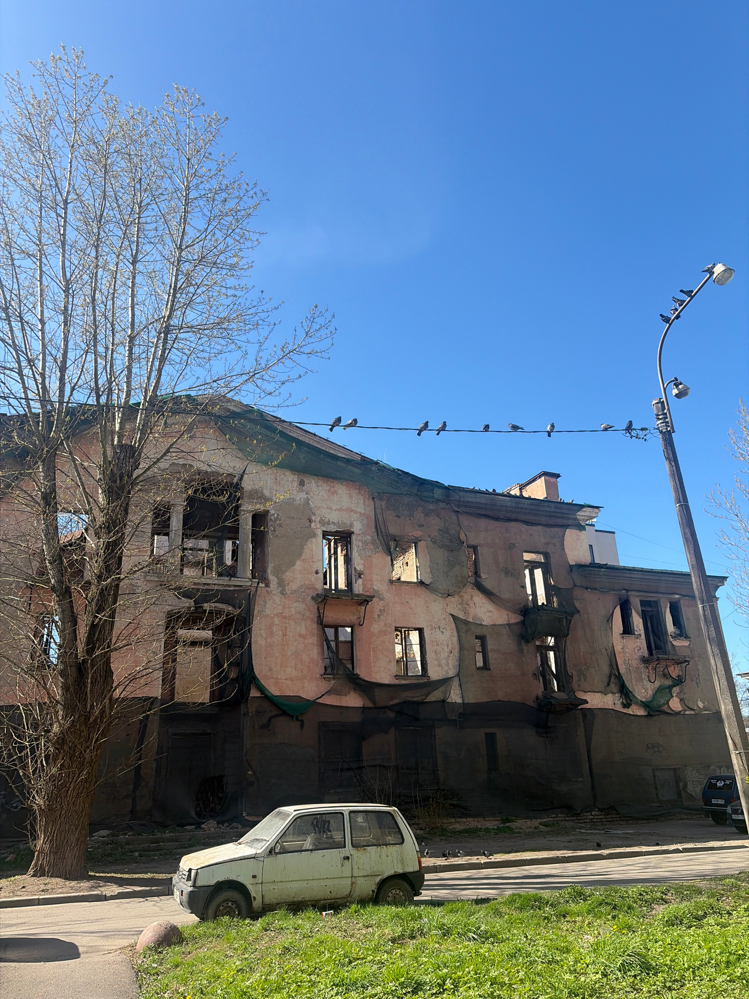This image depicts a dilapidated urban street scene in Saint Petersburg, Russia, under a clear, bright blue sky. The central subject is a multi-story building, severely deteriorated with crumbling, fa…read more