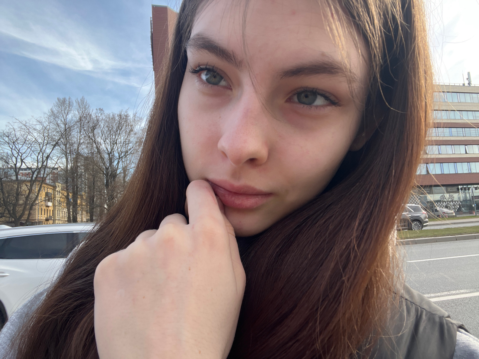 A selfie taken outdoors with the image rotated 180 degrees. A woman with long brown hair and fair skin looks directly at the camera with a contemplative expression. Her left hand is raised to her face…read more