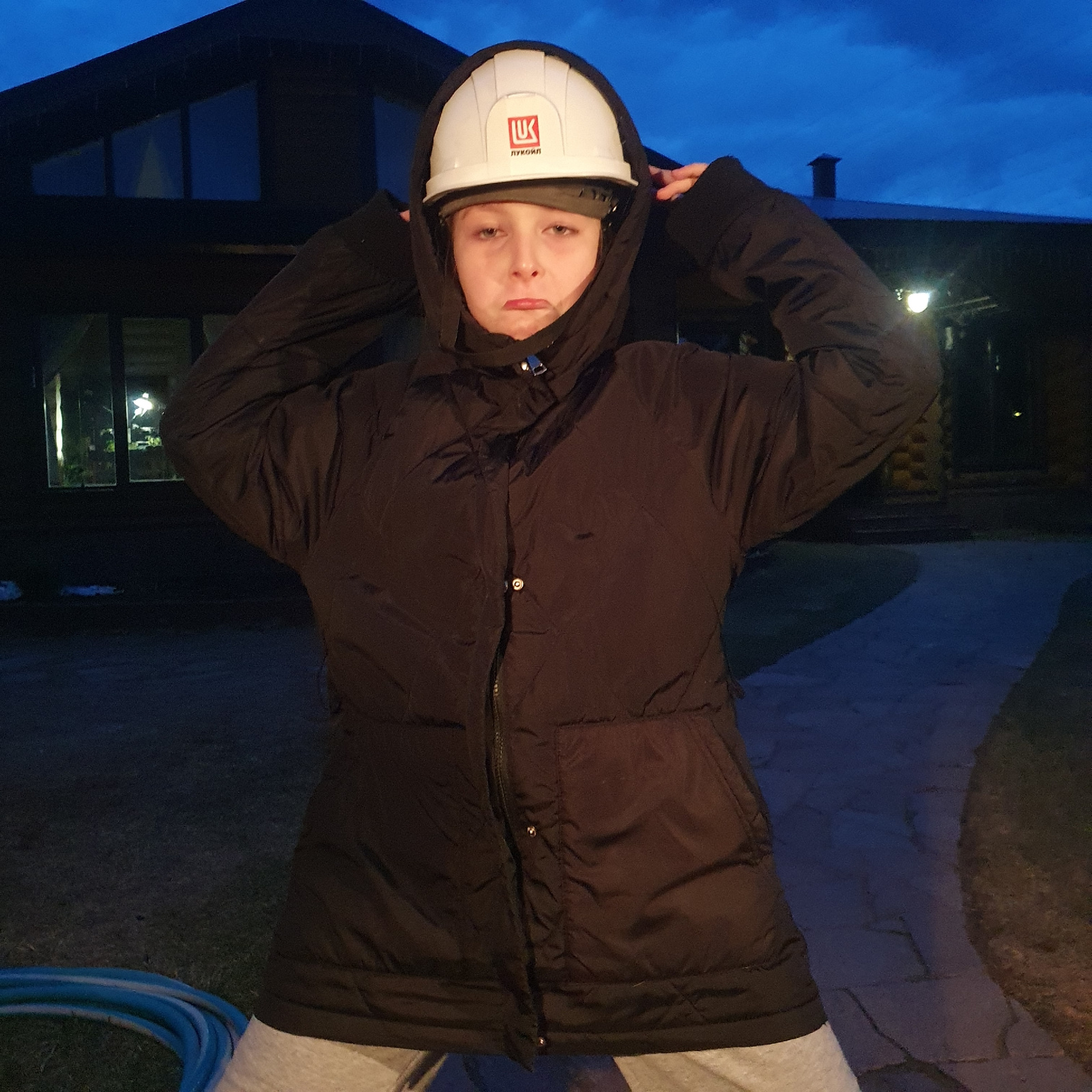 A person wearing a black hooded jacket and a white hard hat is standing outdoors. The hard hat has a red and white logo on the front. The person is looking towards the camera. The background shows a b…read more