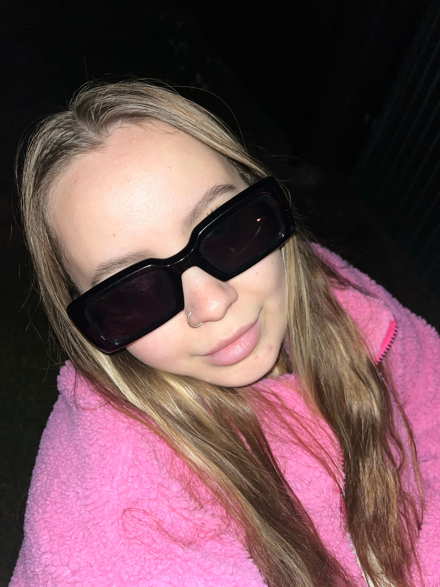A young person wearing sunglasses and a pink jacket is lying down. The background is dark. The person has blonde hair and a nose ring. The photo may have been taken at night or in a dimly lit area. No…read more