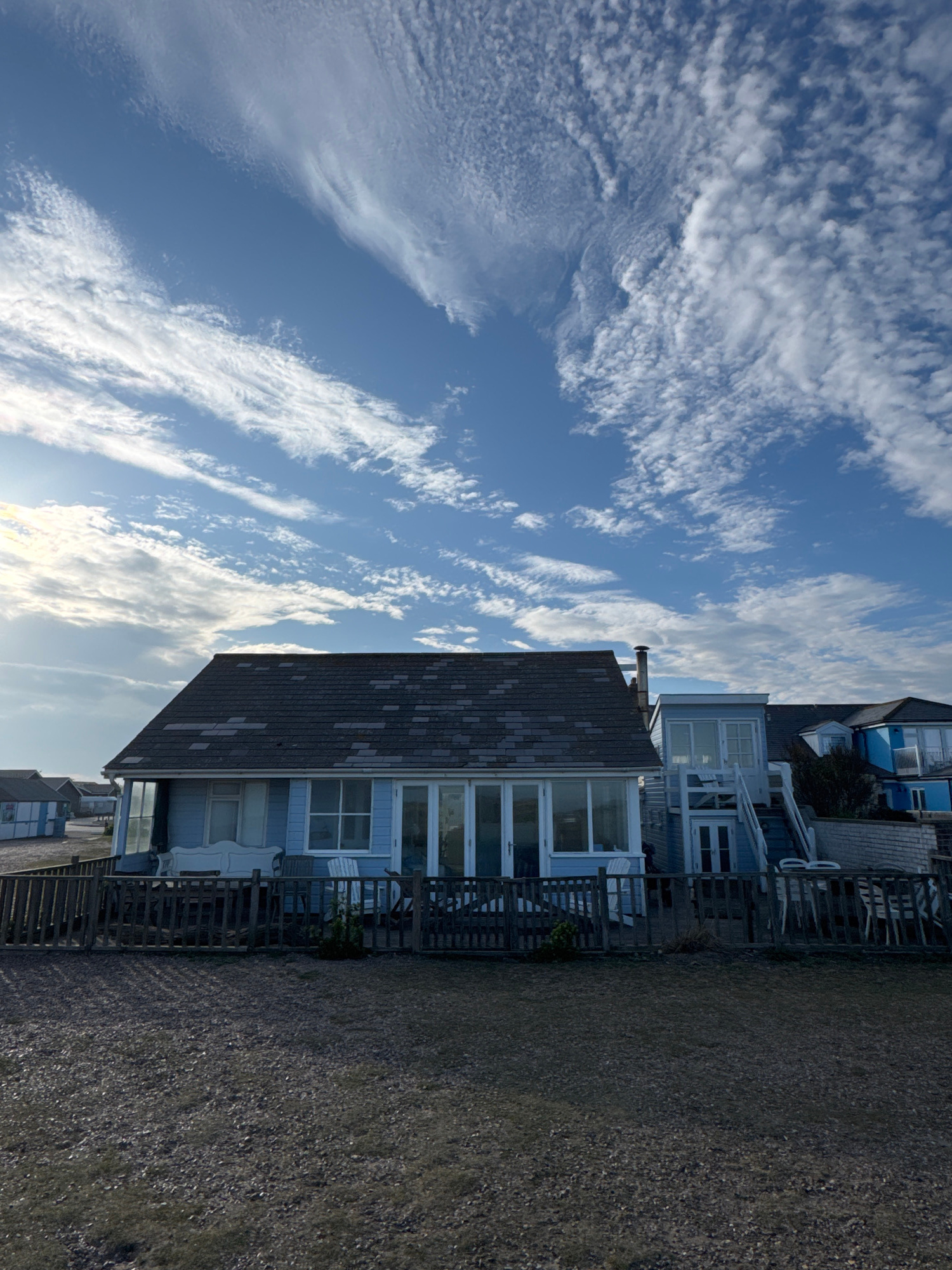 The image shows a view of beachside houses against a blue sky with wispy clouds. The location is likely in East Suffolk, United Kingdom, given the request. The houses are light blue. A shingle beach sā¦read more
