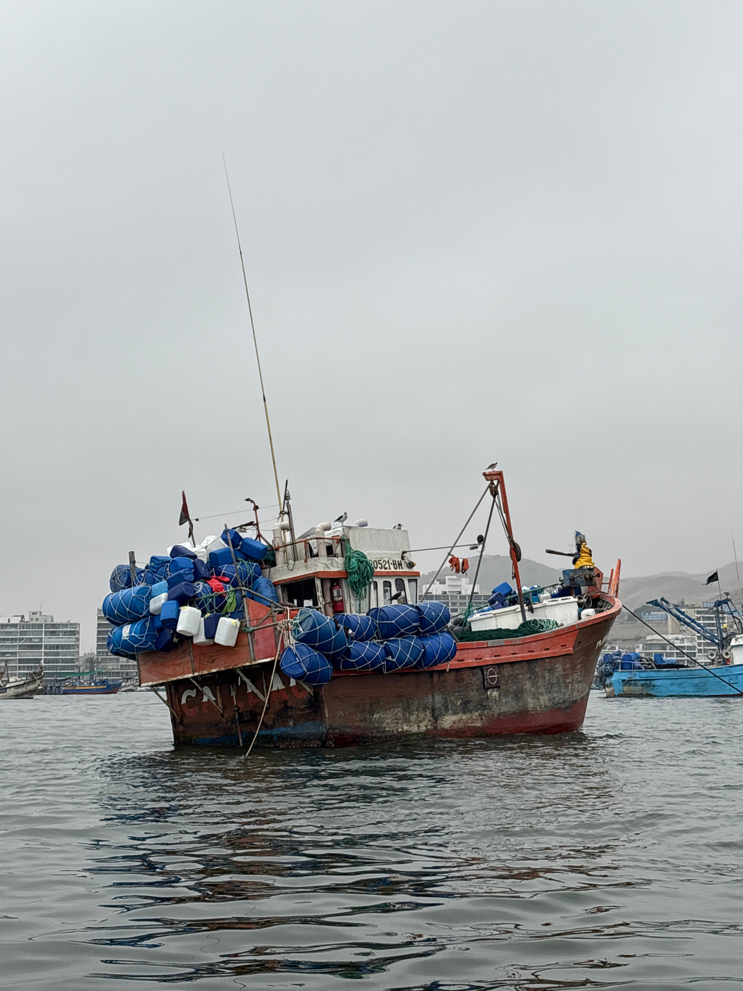 The image shows a fishing boat loaded with blue floats moored in the water. The boat is partially rusted and heavily equipped with fishing gear. In the background are buildings, indicative of the city…read more