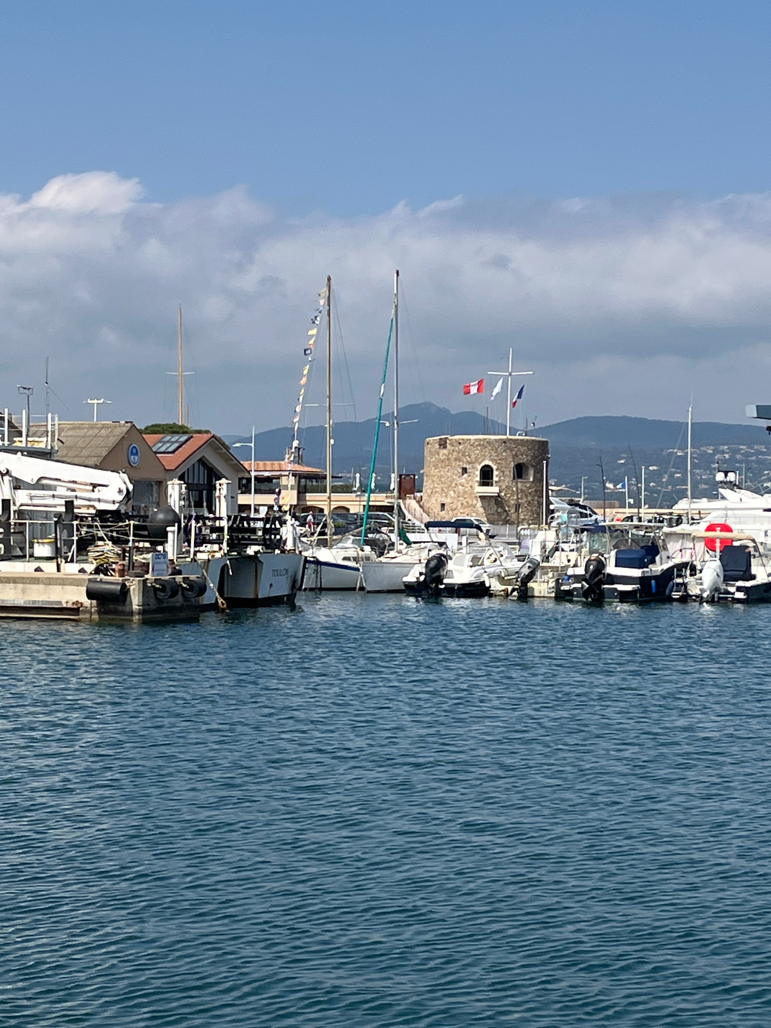 The image captures a marina scene in Saint-Tropez, France. The foreground shows various boats moored along a pier, ranging from sailboats to motorboats. The water of the marina is visible to the right…read more