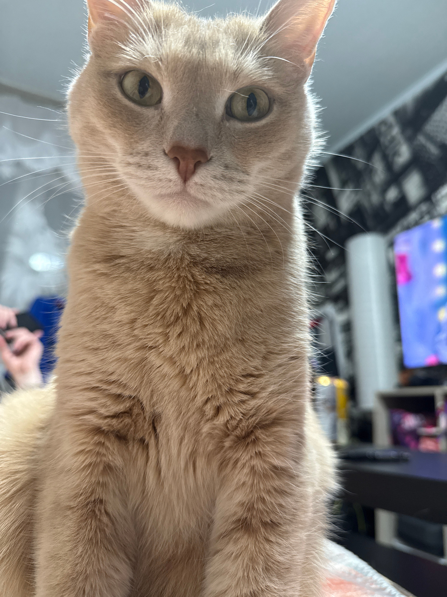 A close-up, somewhat distorted, slightly rotated image of a light orange cat looking down at the viewer. The cat has green eyes and a pink nose. The background is blurry, but appears to include a tele…read more