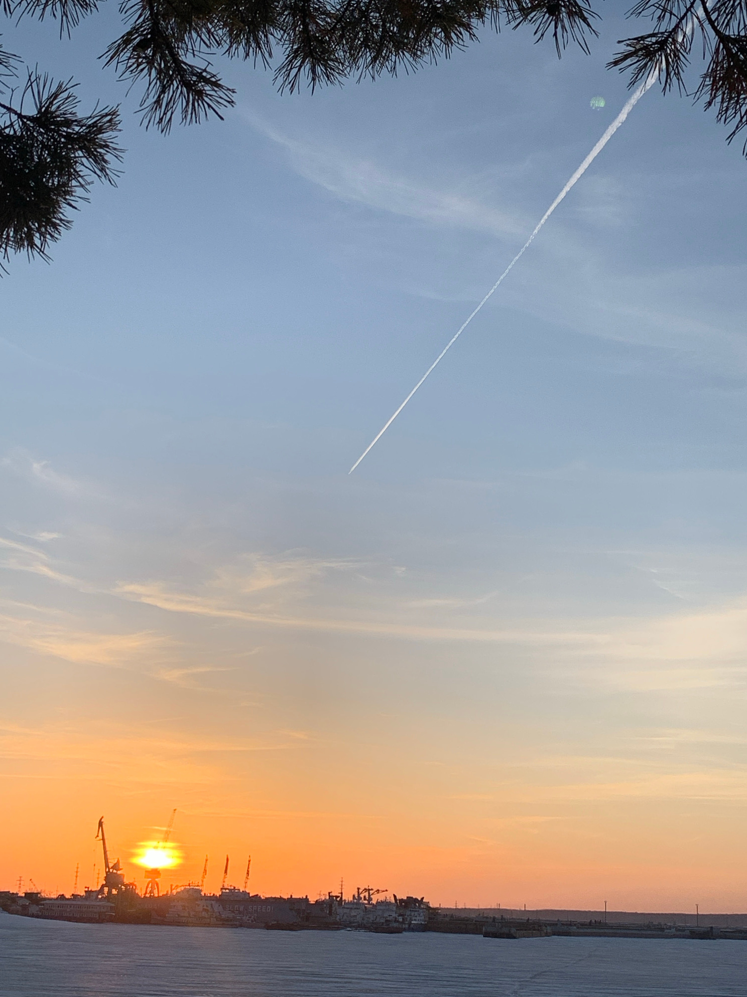 The image shows a view of a sunset over what appears to be a body of water with a city skyline on the horizon. The sunset displays orange and yellow hues in the sky. Structures and cranes are visibleβ¦read more