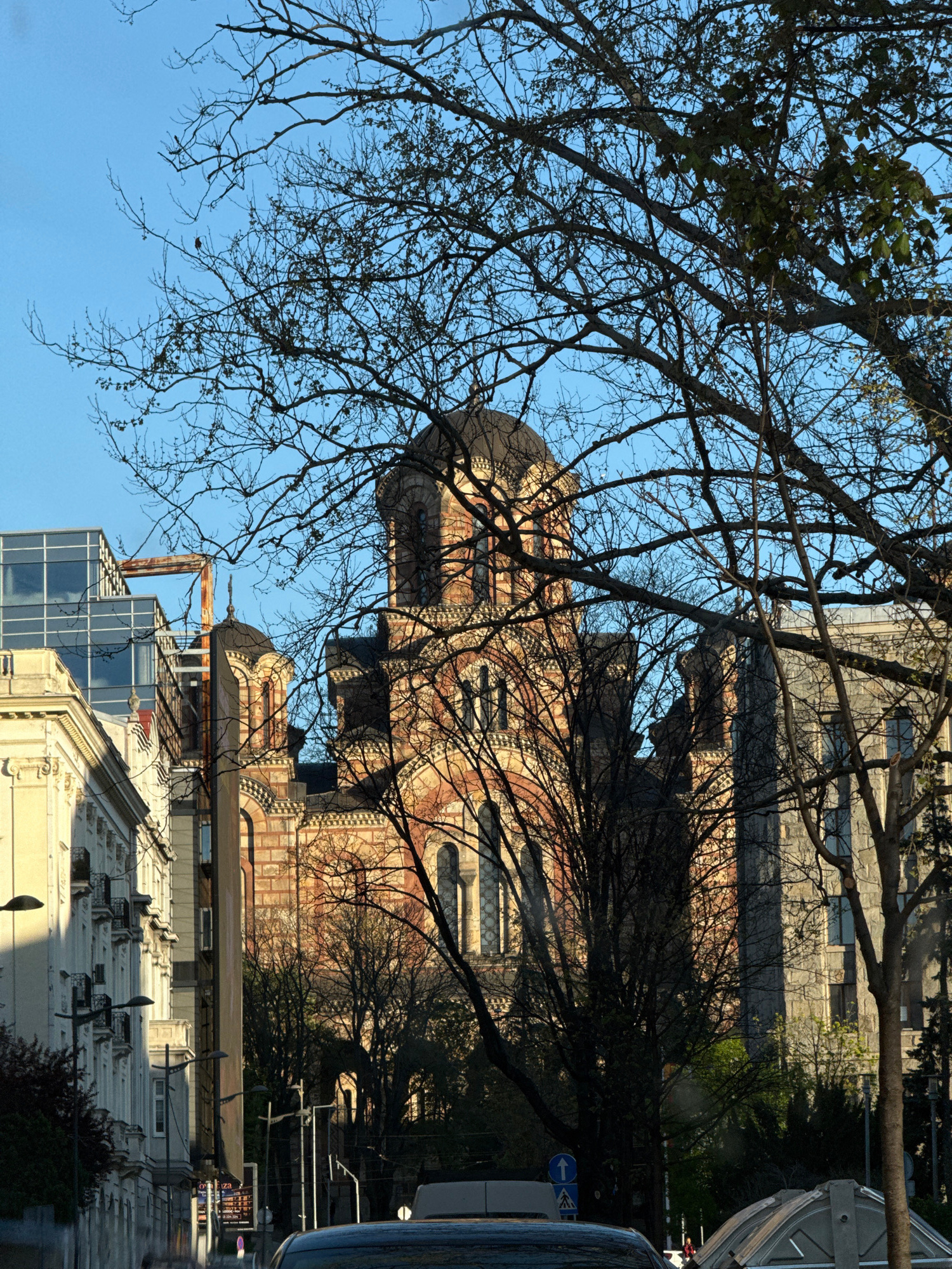 The image shows a low-angle view of buildings in Belgrade, Serbia, partially obscured by bare tree branches. The most prominent building is a large, historic structure with a dome, decorated with bric…read more