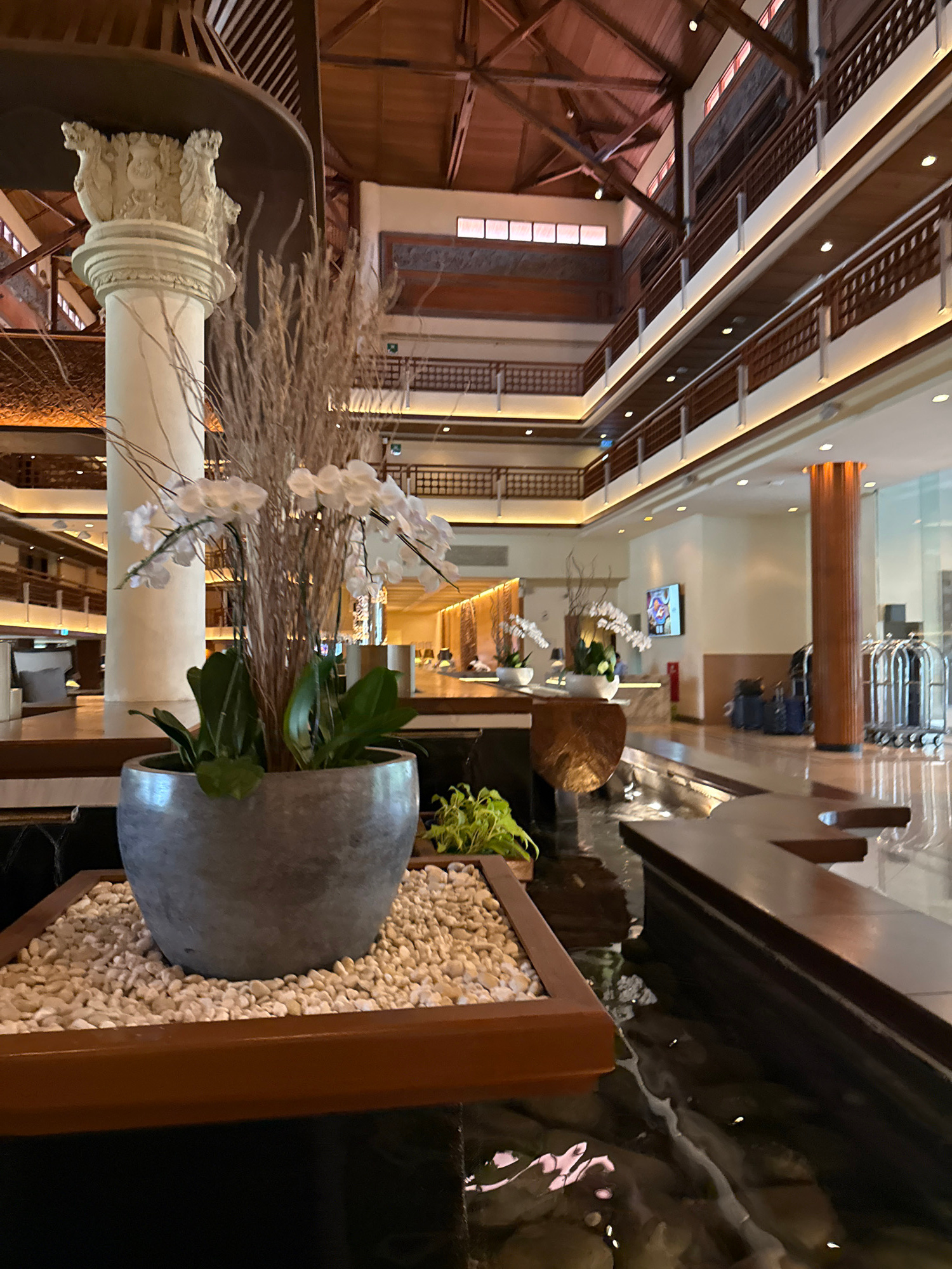 The image shows the interior of a building in Nusa Dua, Indonesia. The architecture features a blend of traditional and modern elements, with a high, wooden-beam ceiling and open structure, contrasted…read more