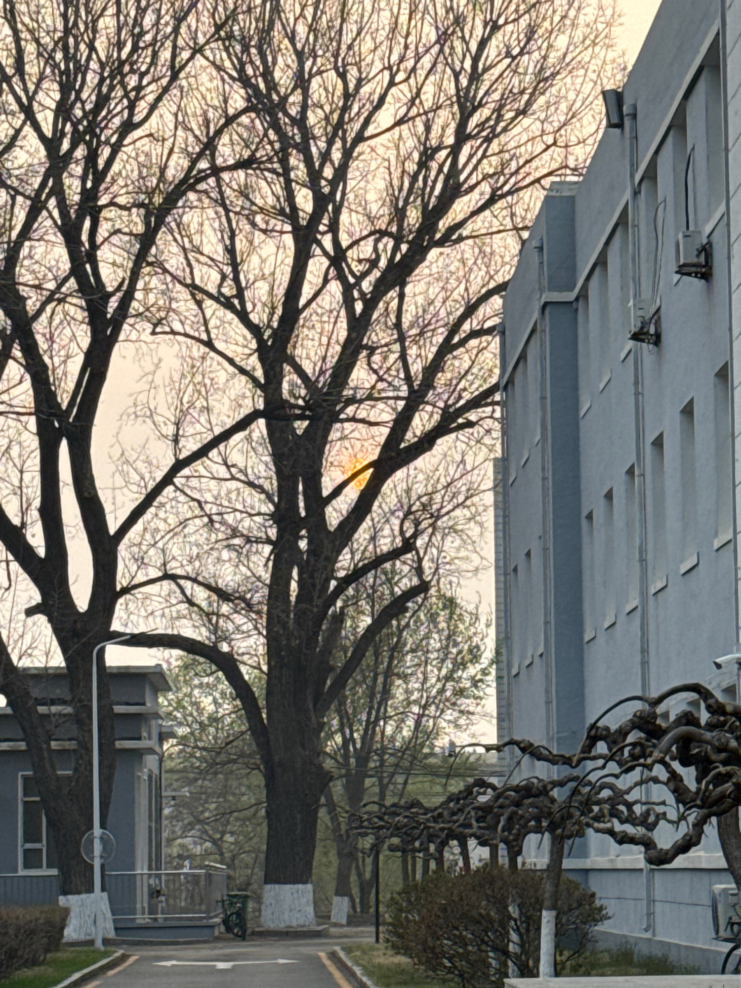 The image shows a row of trees along a road, possibly a street. The trees are mostly bare, with only a few leaves remaining. Above the trees is a building structure. It's located in Zhongtun, China.