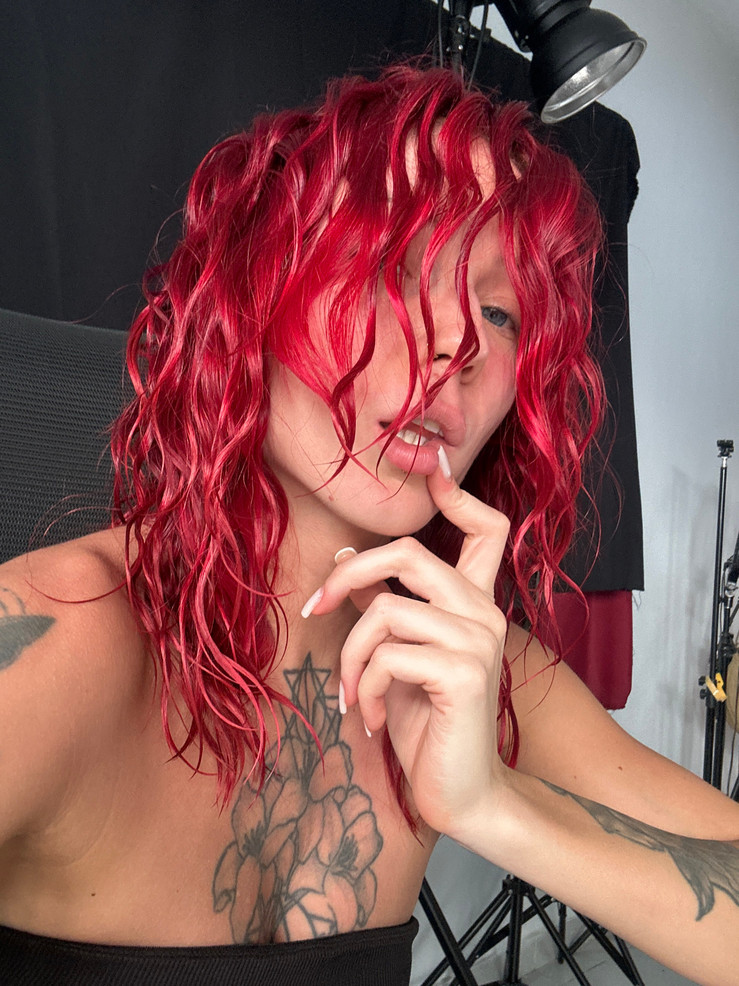A woman with red wavy hair is lying down, her head angled to the side and slightly tilted towards the camera. She has light skin, blue eyes, and is biting her lower lip with her fingers near her mouth…read more