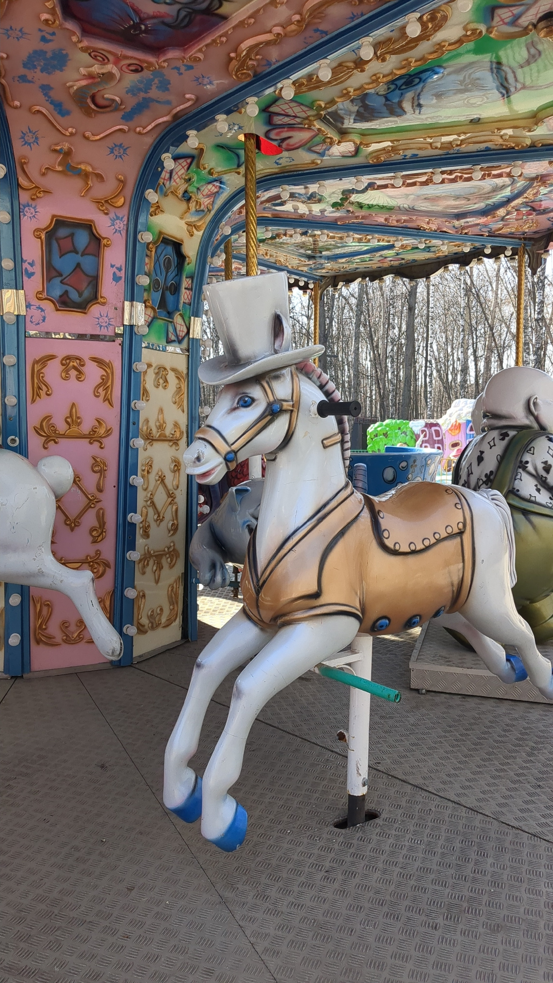 This image captures a close-up view of a stationary carousel, likely located in an outdoor amusement area in Ulyanovsk, Russia. The scene is brightly lit by natural daylight, with bare trees visible i…read more