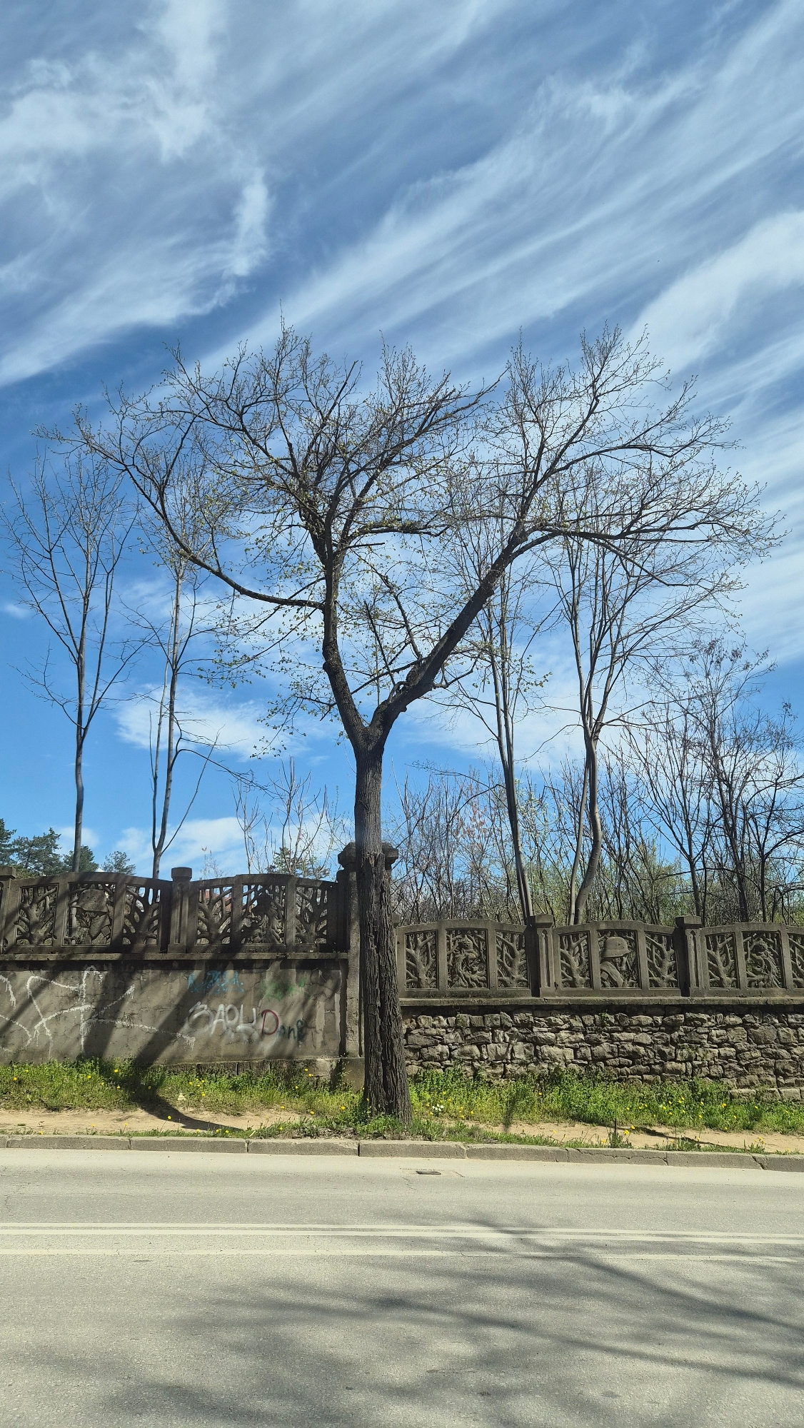 A vertical outdoor shot depicts a clear blue sky with cirrus clouds. Adjacent is a bare tree with the start of budding leaves, standing next to an ornate concrete fence with graffiti on a section of t…read more